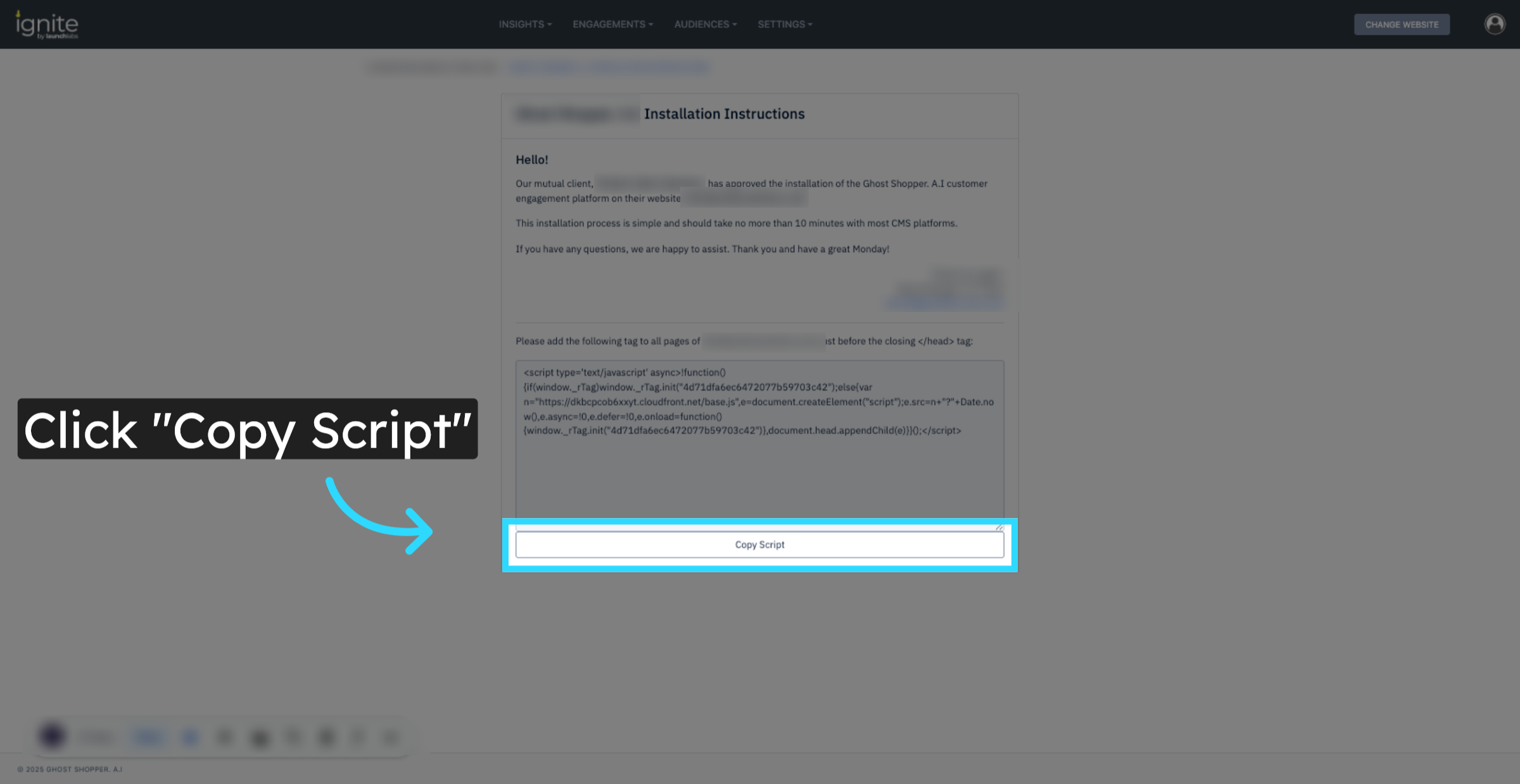 Inside the instructions panel, click Copy Script to copy the tag from this view as well. As before, share this script with your IT team or website administrator for implementation.