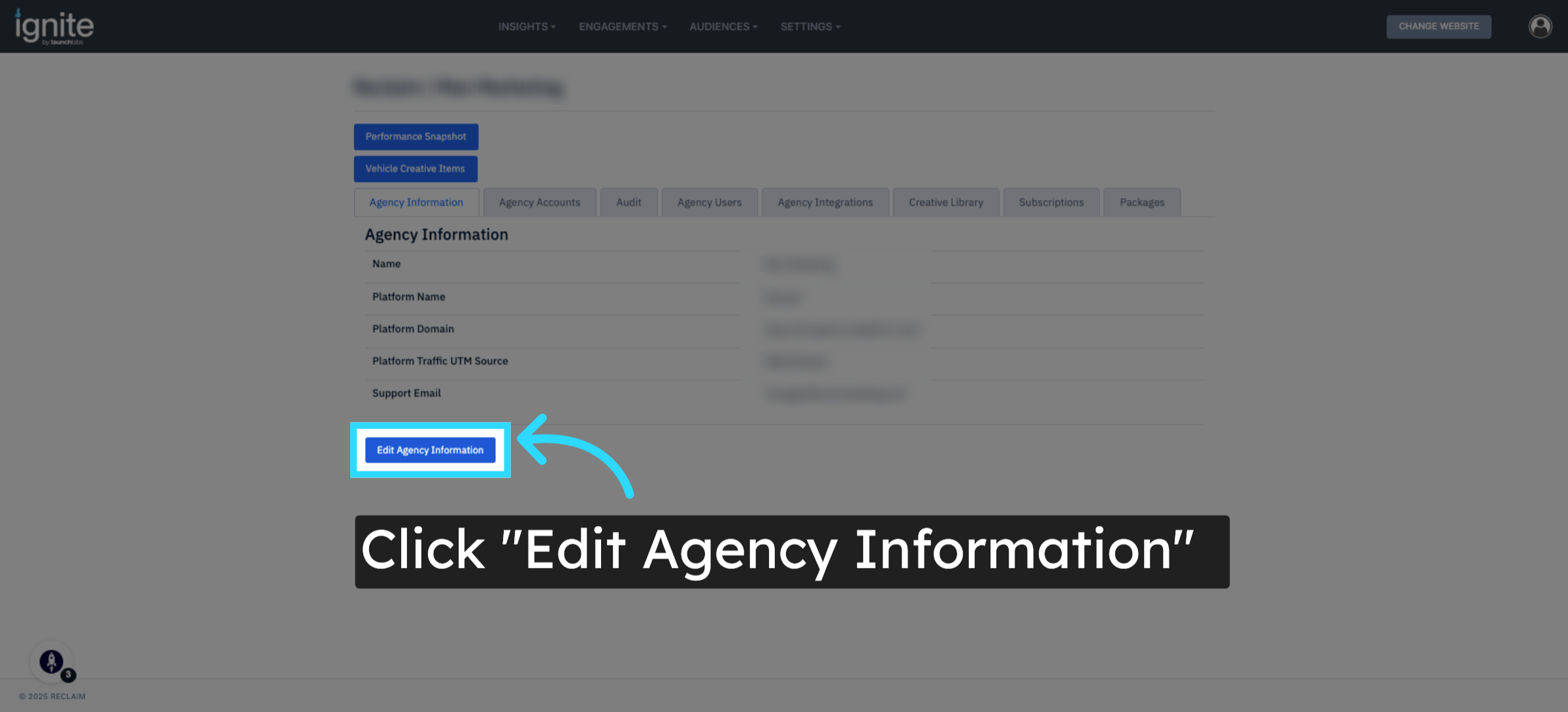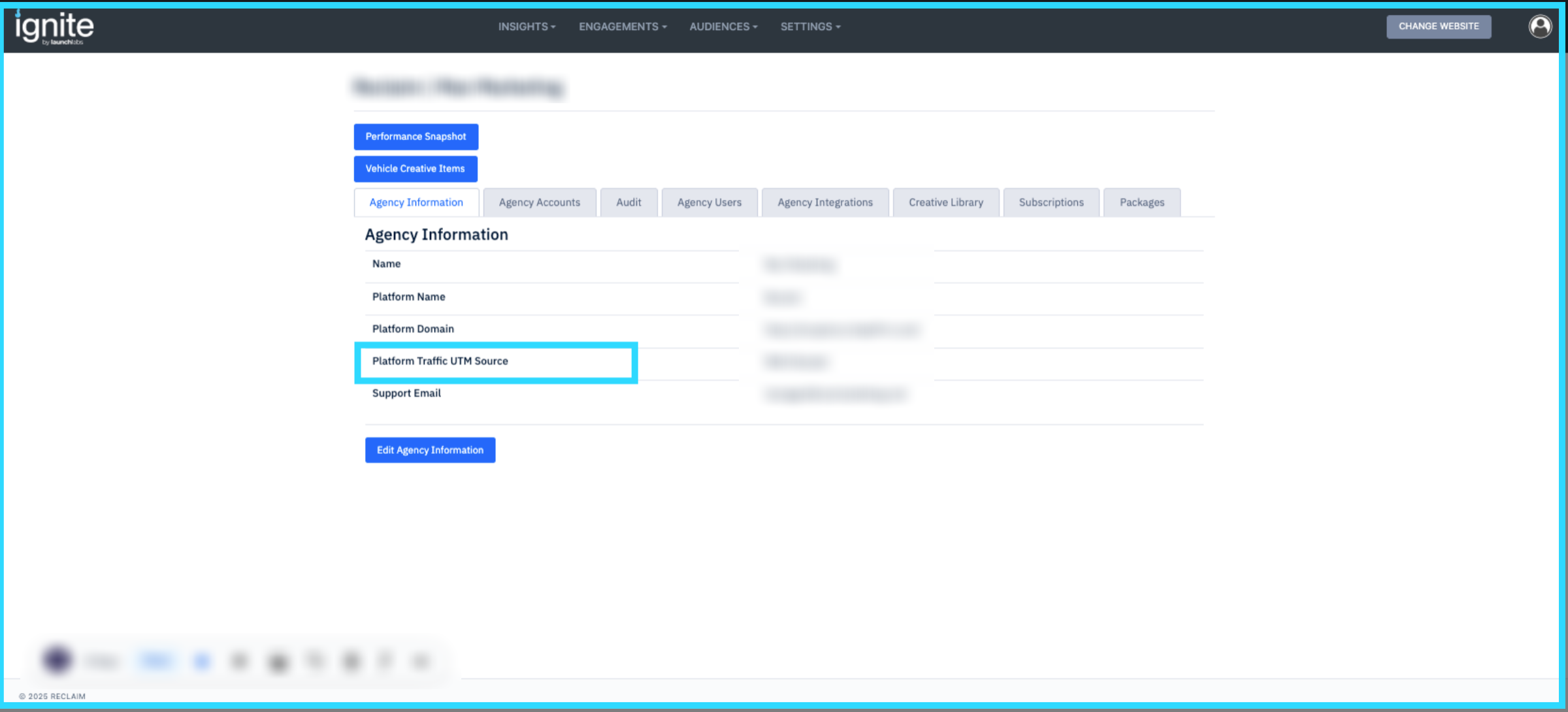 Click Edit Agency Information to modify your agency’s settings. This allows you to update the UTM code and make other necessary adjustments.