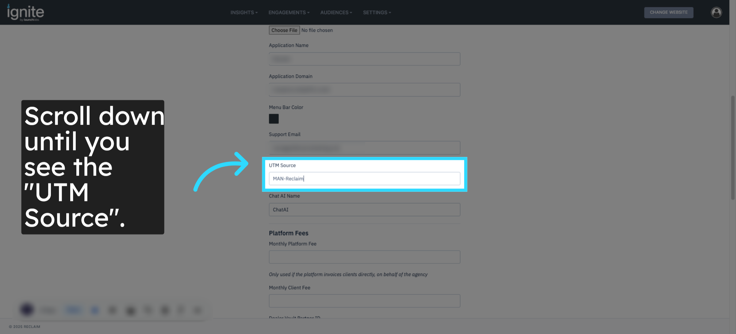 Scroll down to locate the UTM Source textbox. In this field, enter or edit the desired UTM code that will be applied to your agency’s tracking links. Be sure to double-check for accuracy, as this impacts how your traffic sources are recorded.