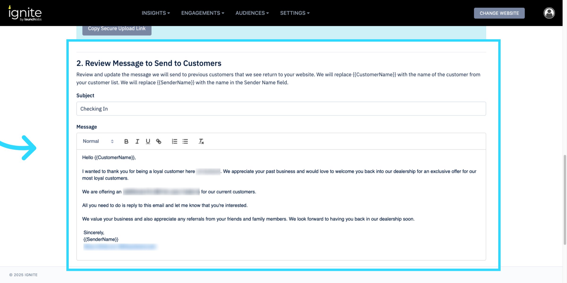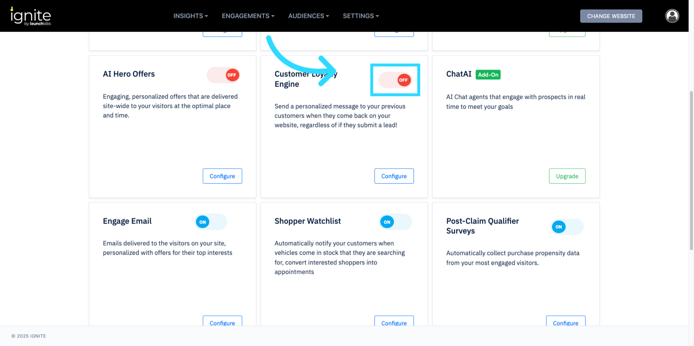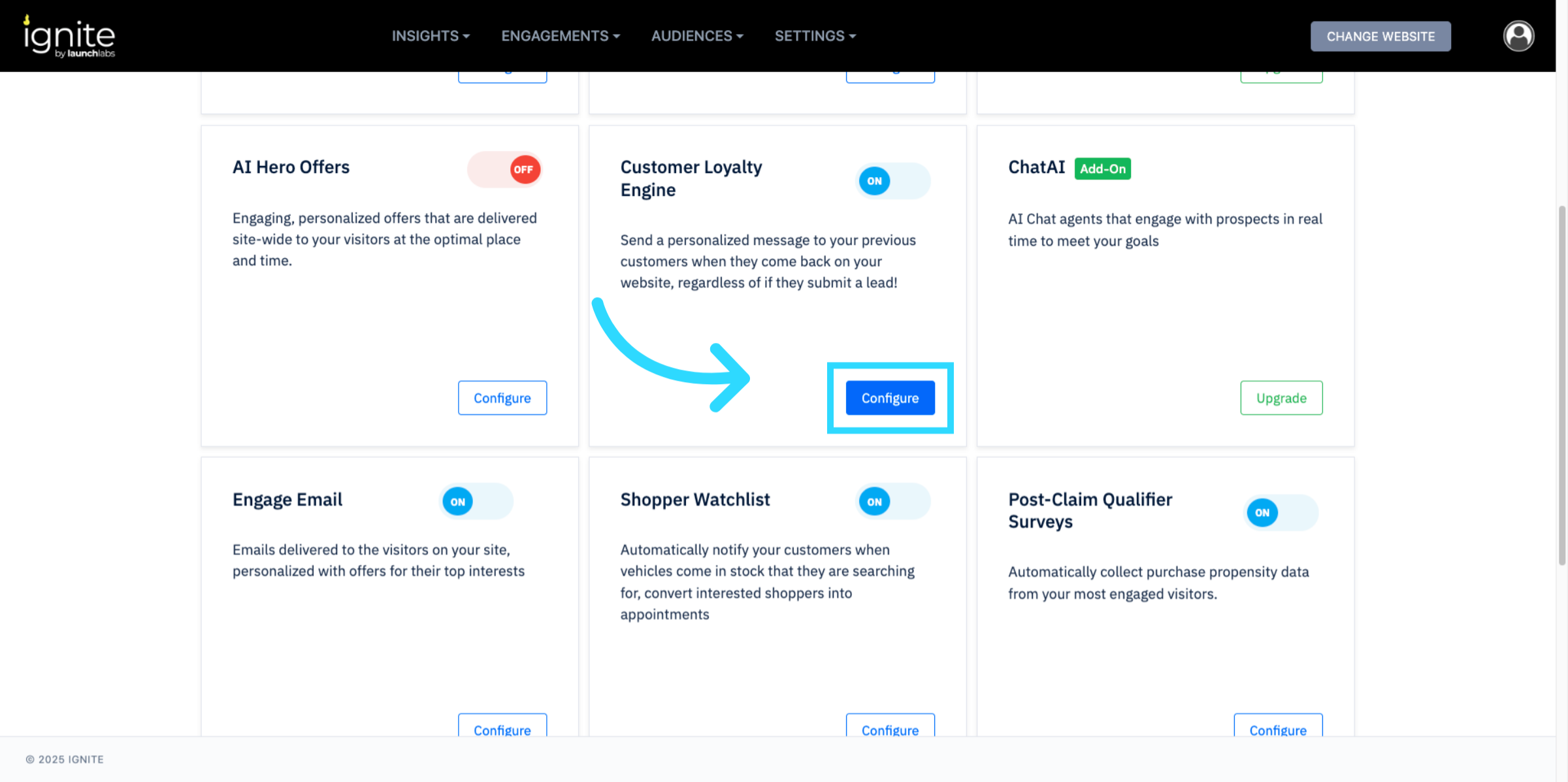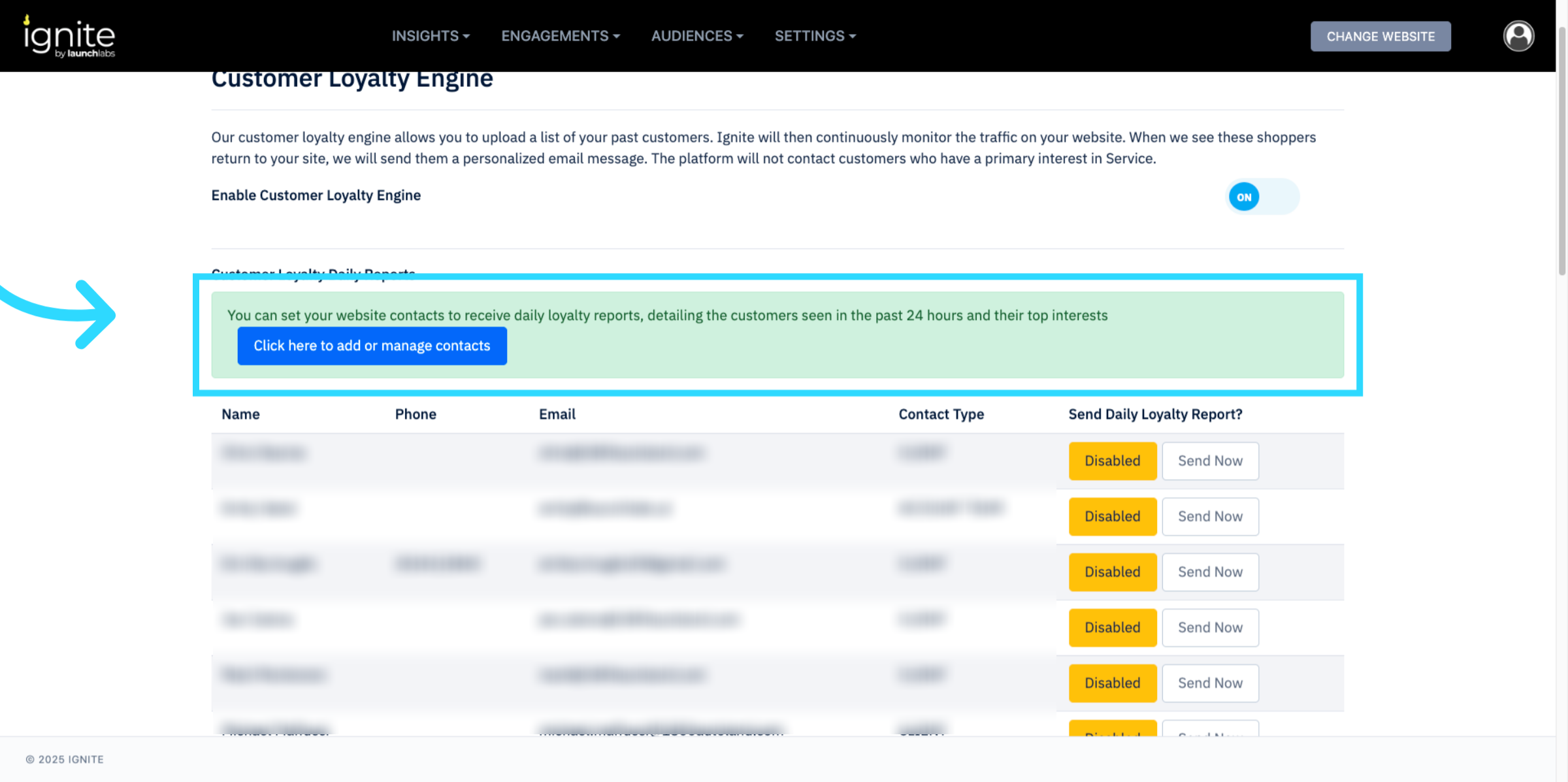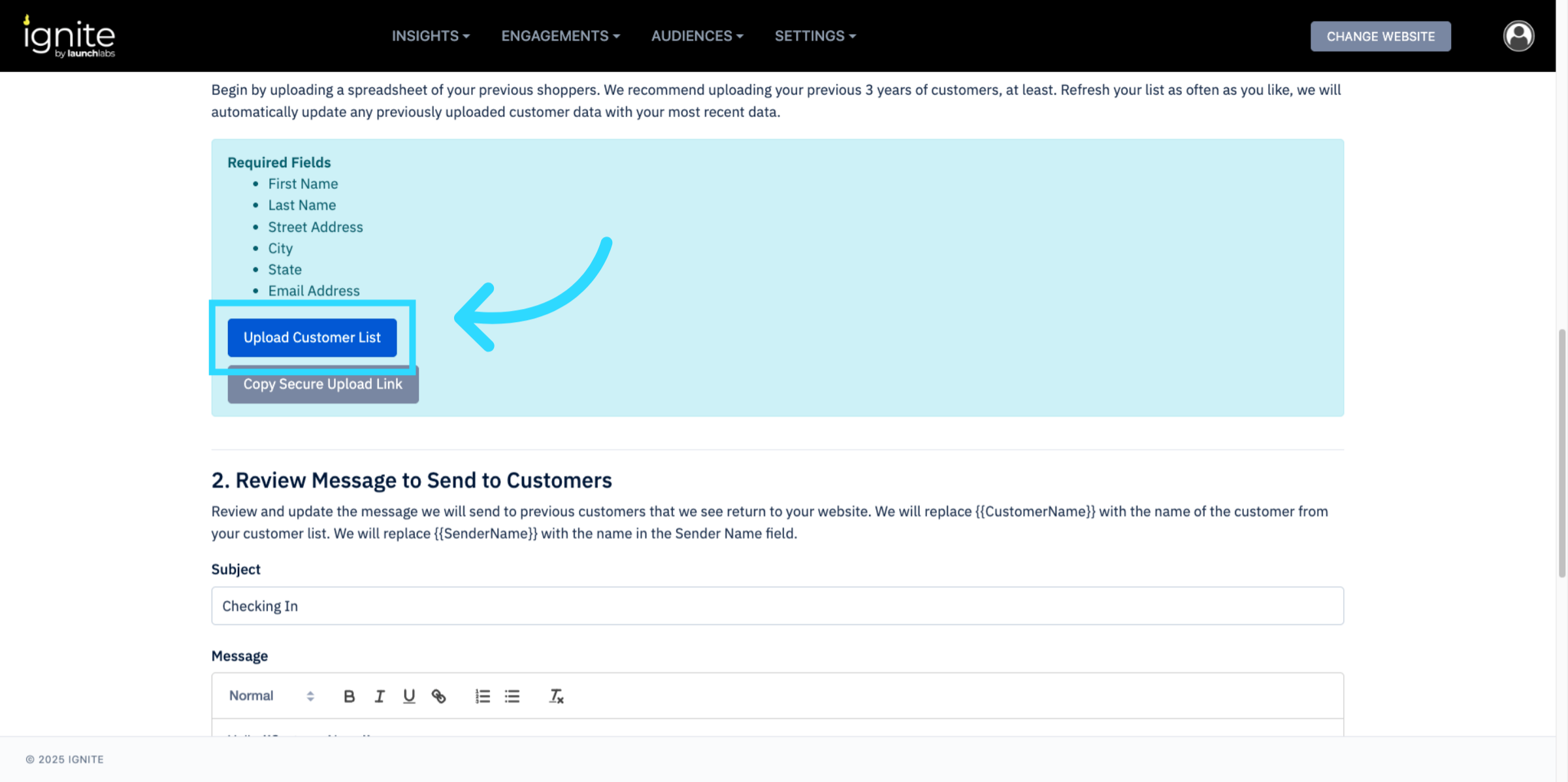 This article explains how to configure the Customer Loyalty Engine in Ignite. The Customer Loyalty Engine allows you to upload a list of past customers so Ignite can monitor your website traffic. When returning customers are detected, they receive a personalized email message — helping you drive repeat engagement and retention.