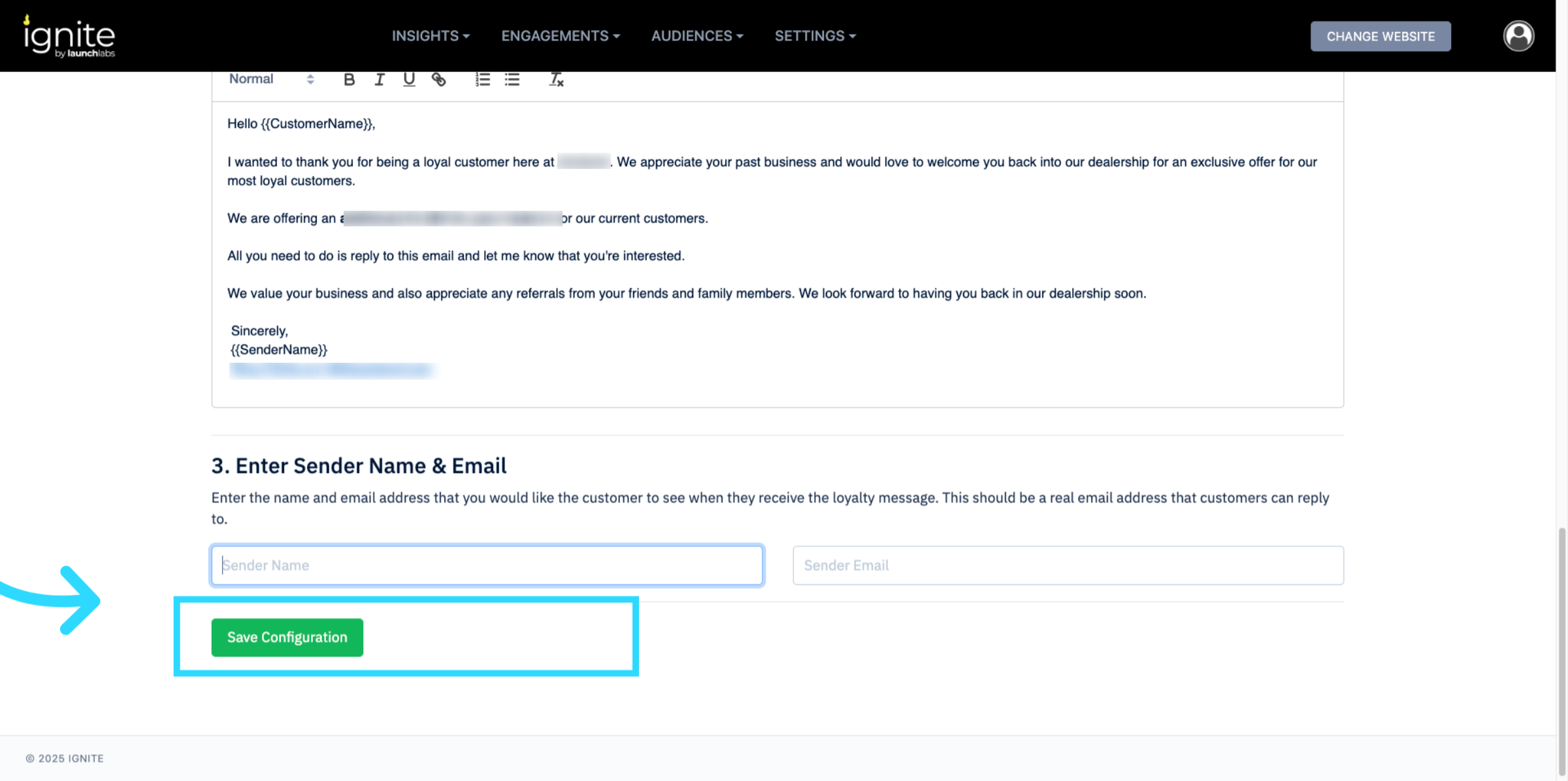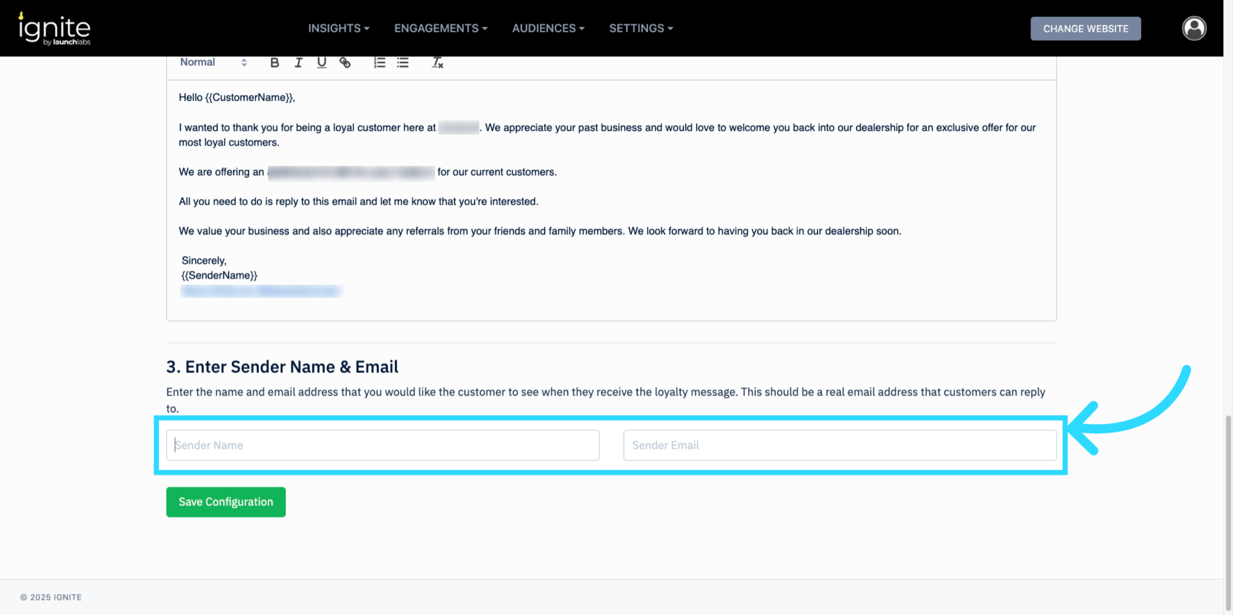 Enter the Sender Name and Sender Email for the outgoing message. Typically, this will be the dealership manager or another recognizable contact.