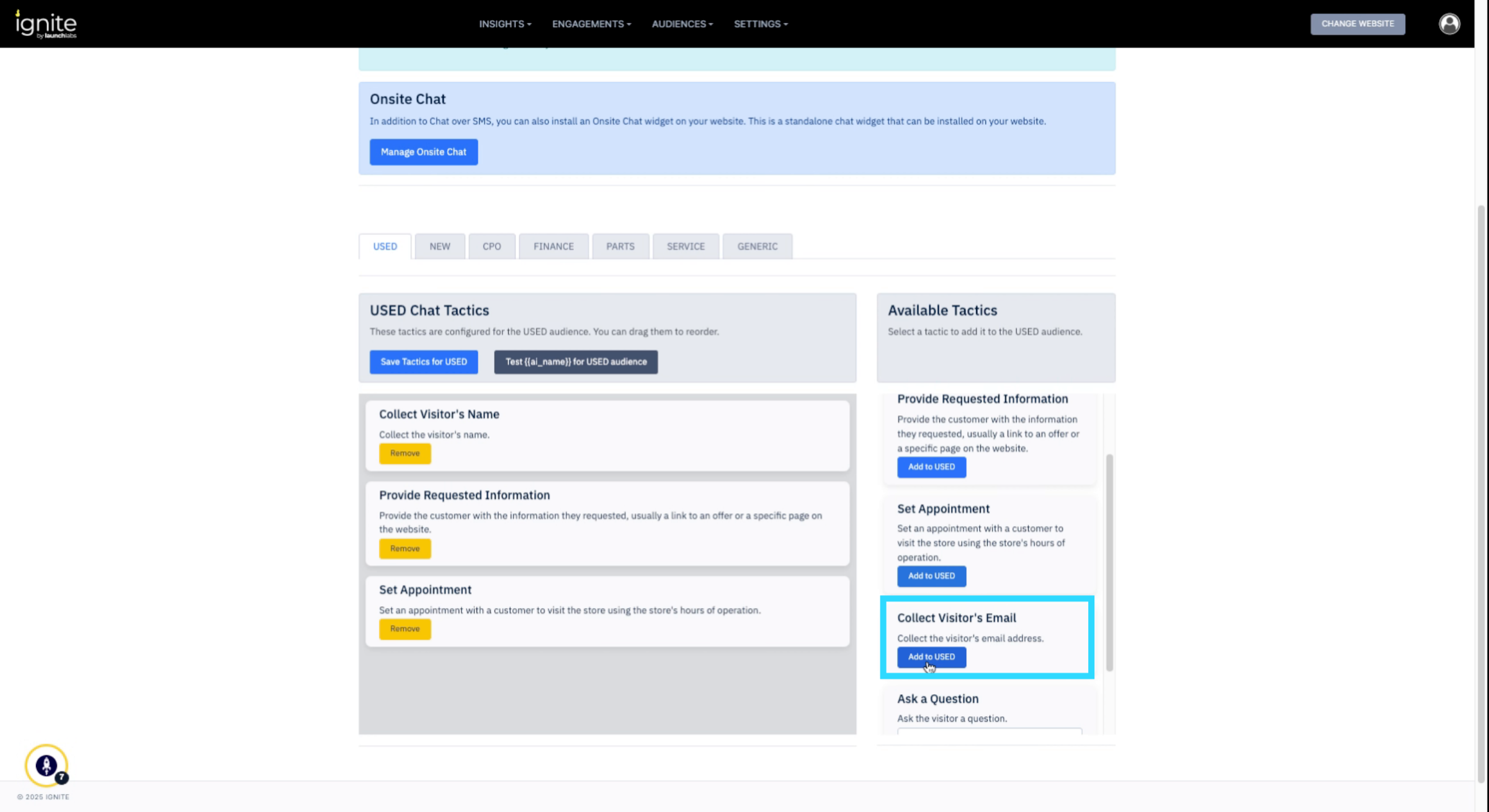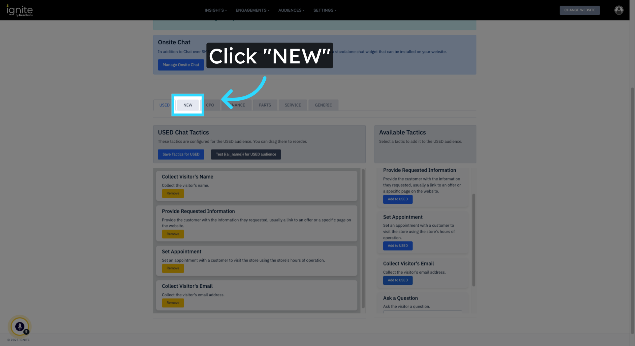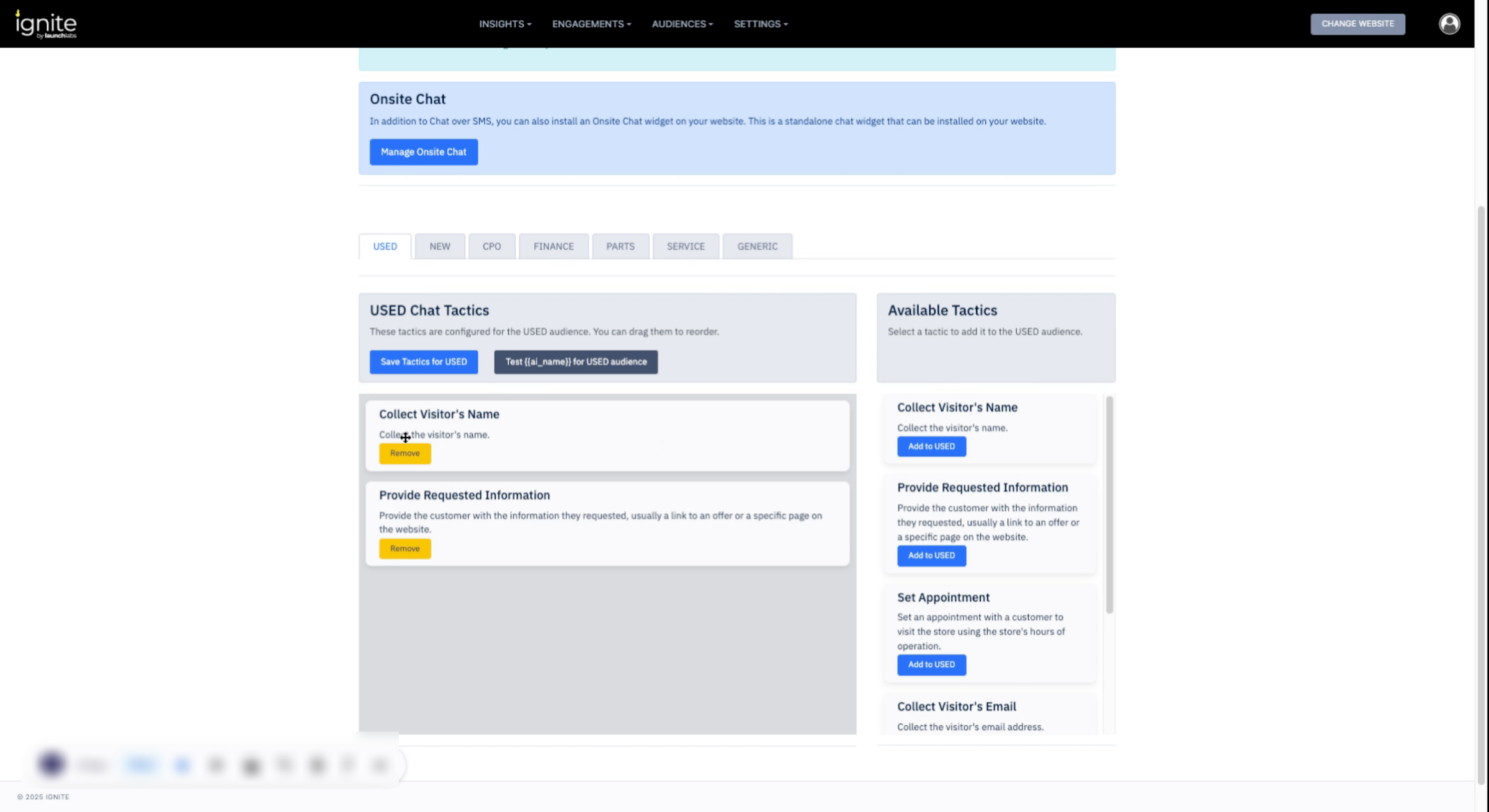 This article explains how to configure ChatAI in Ignite so it can engage with your website visitors and help set appointments. You'll learn how to enable specific tactics such as collecting visitor information and scheduling appointments for both New and Used Model visitors.