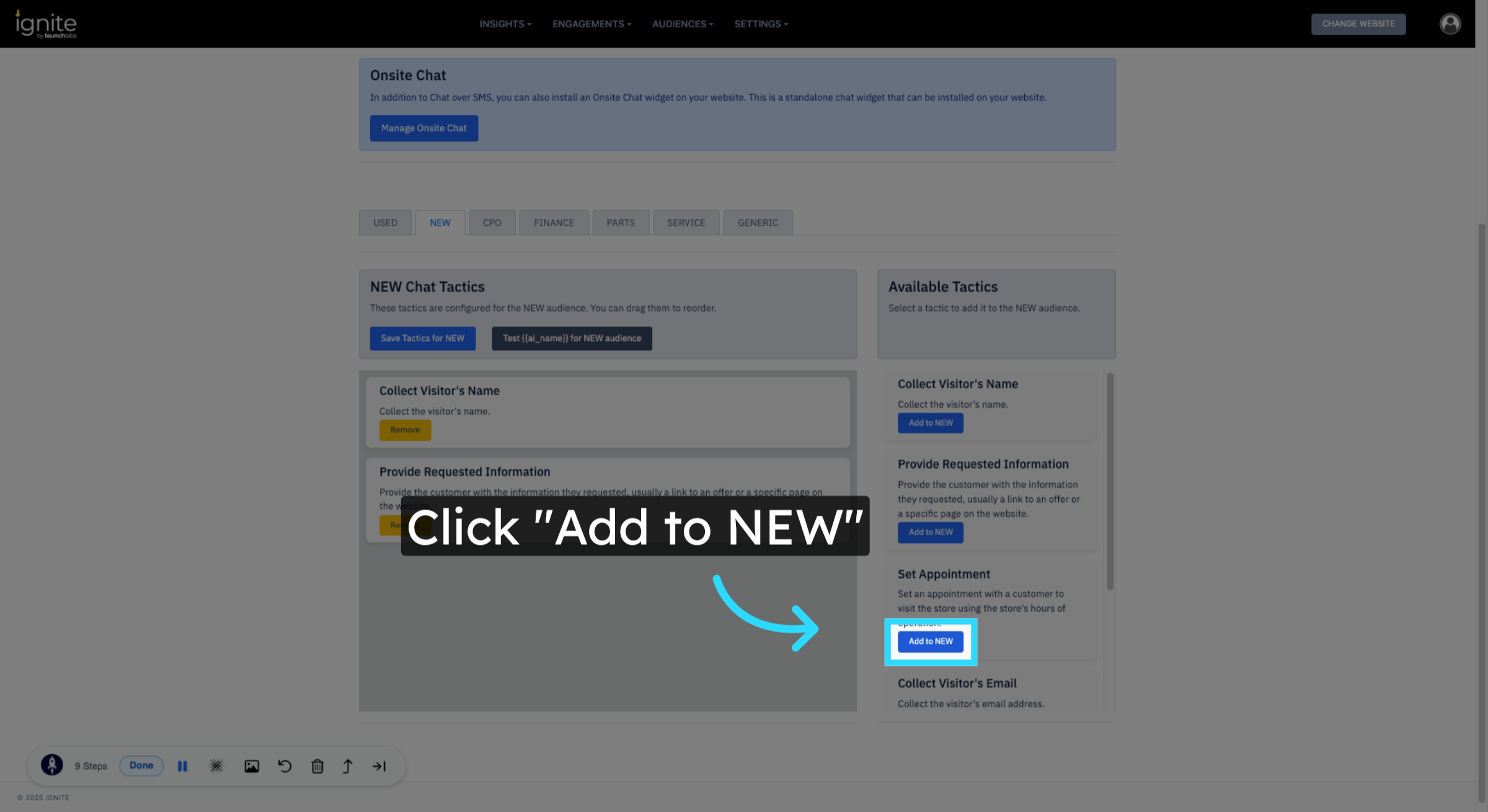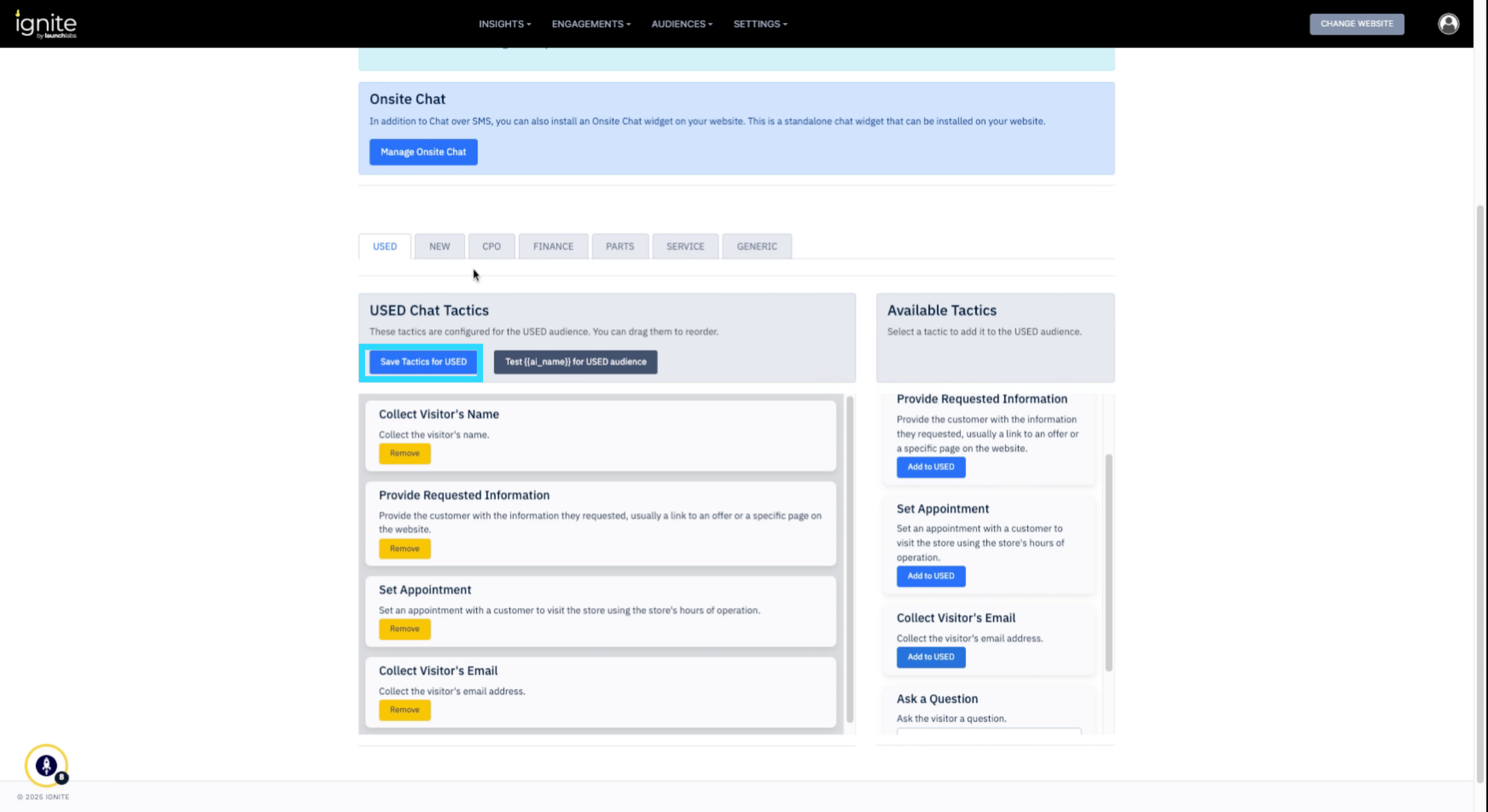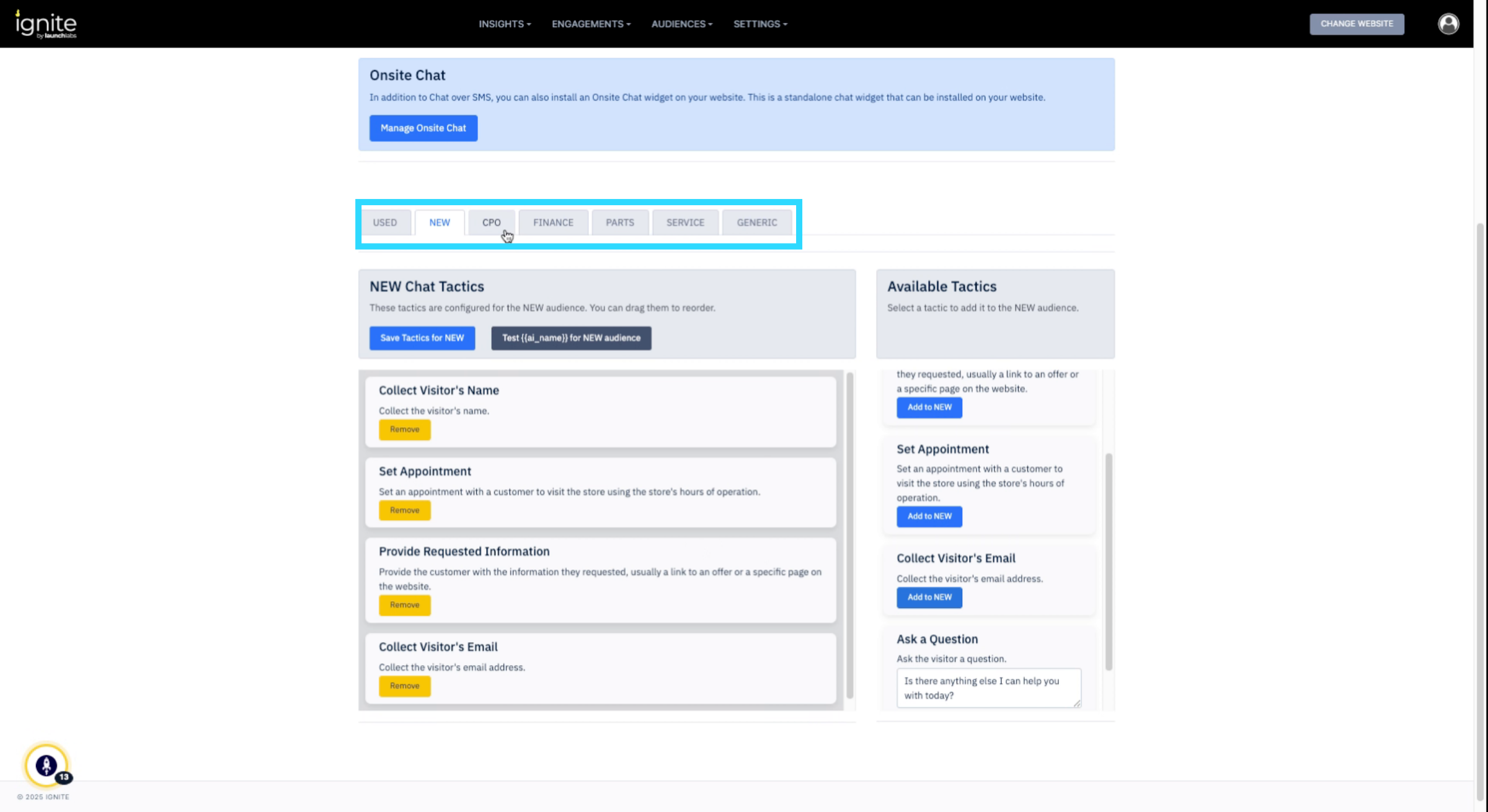 This article explains how to configure ChatAI in Ignite so it can engage with your website visitors and help set appointments. You'll learn how to enable specific tactics such as collecting visitor information and scheduling appointments for both New and Used Model visitors.