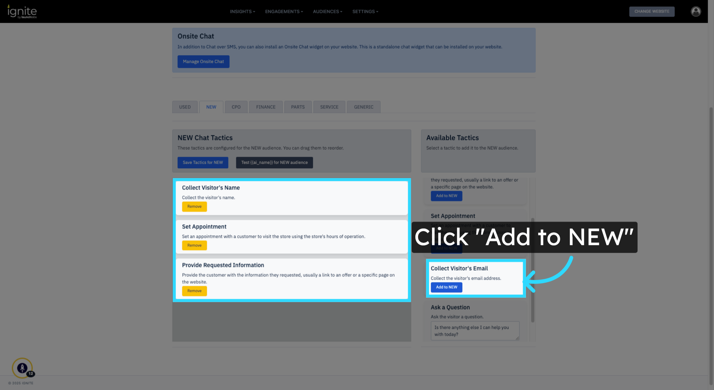 Click Add to NEW next to the Set Appointment tactic, just as you did for Used visitors. You can customize the order of the tactics to control how Chat-AI responds to users. Once the order is set, add the Collect Visitor’s Email tactic to the configuration.