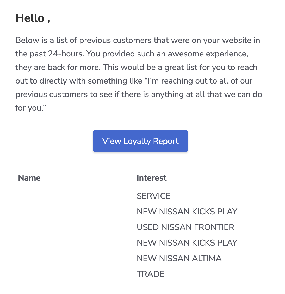 👉 A list of these identified customers will be sent to the designated dealer/agency contacts daily. The email only sends if the platform is able to identify a past customer on that site within the last 24hrs. If no past customers are seen the email will not send. The email itself has a link to be able to view the full list of identified past shoppers within the platform. An example of the email is below: