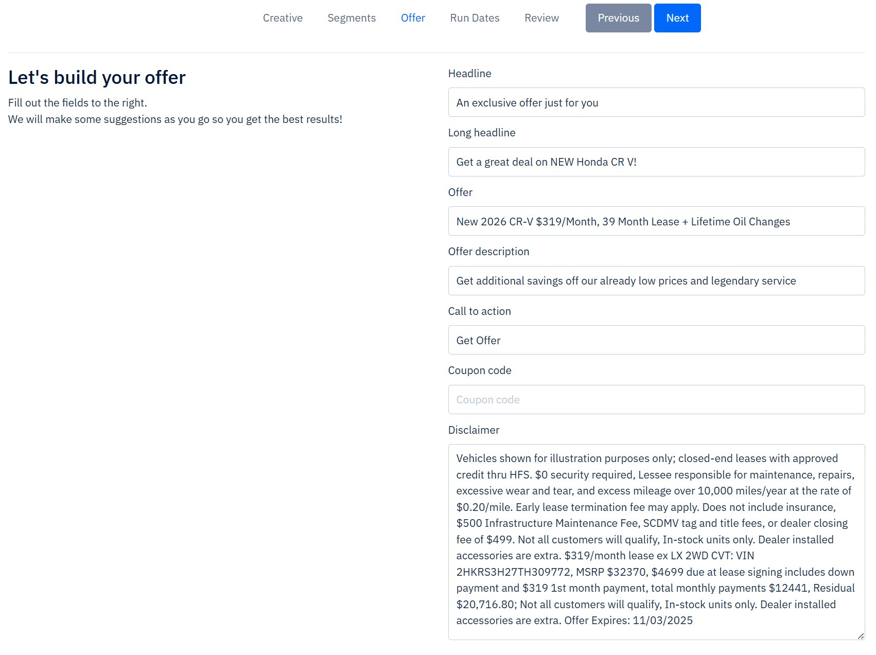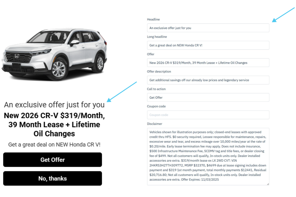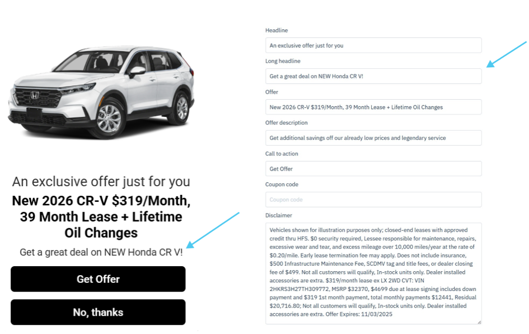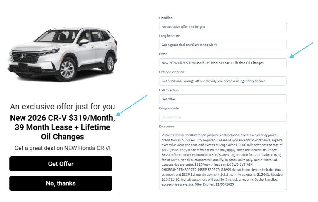 This field is where you will input what you actually want to offer the customers. The offer could be a discounted price, a particular service, or whatever else you would like. A few examples of what you could input are "$500 off, "20% discount on an oil change", or "$1,000 extra value on your trade-in."