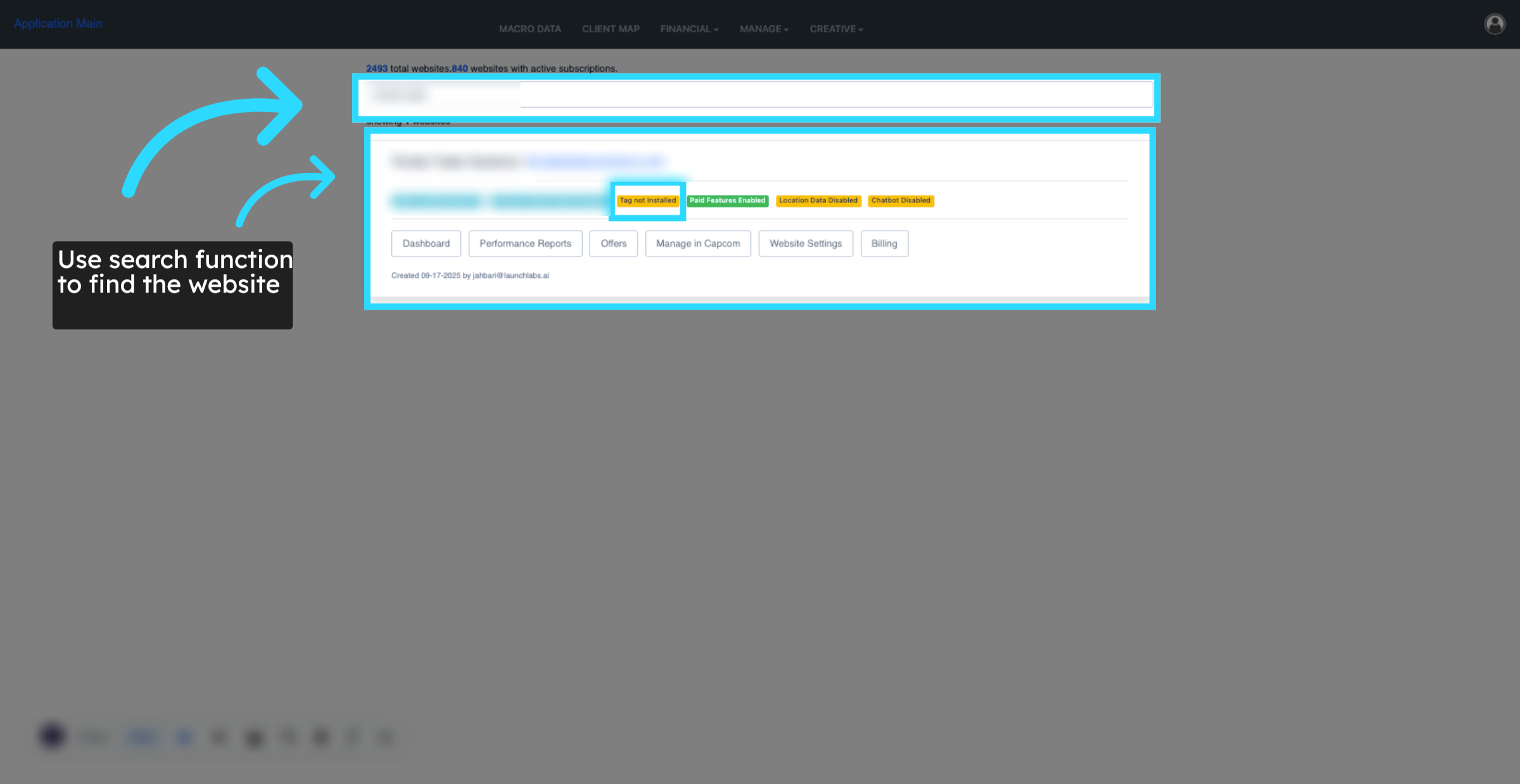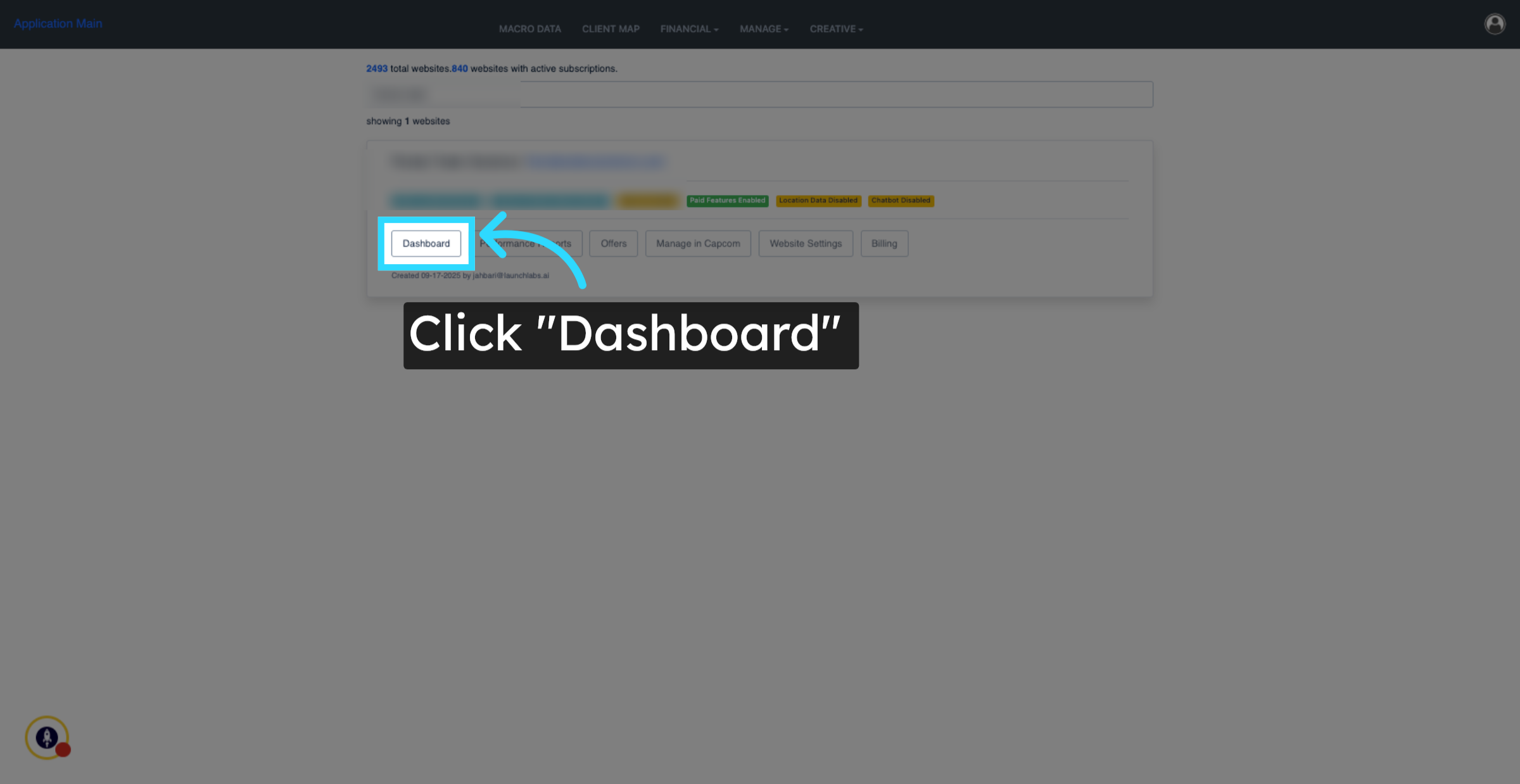 Go to ignite.launchlabs.ai, and use the Search function to find the website you need. Once located, click Dashboard to access the site’s performance overview.