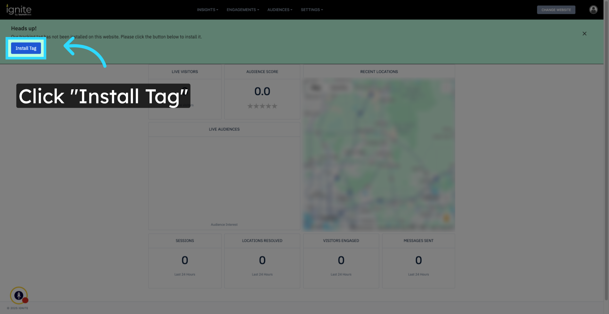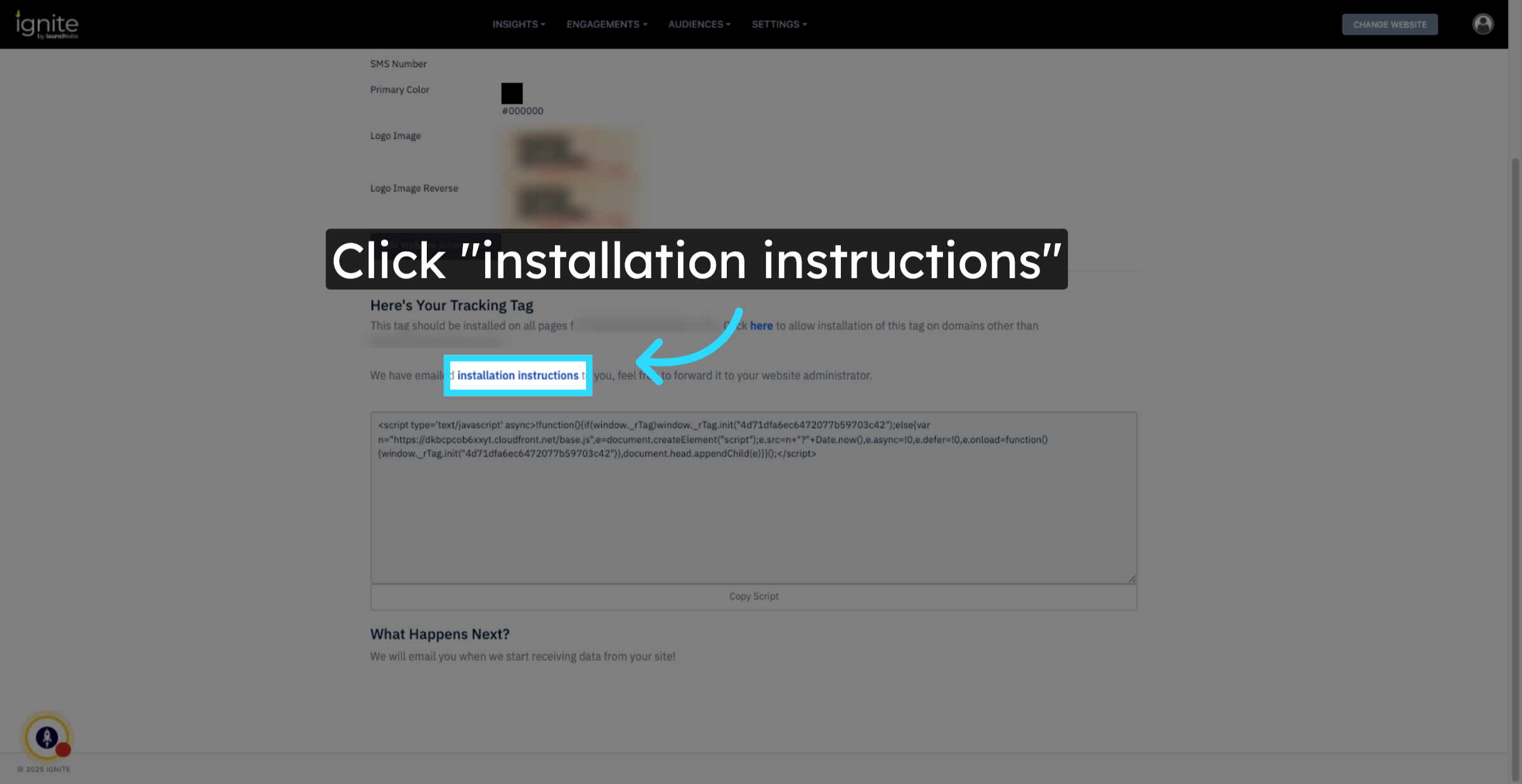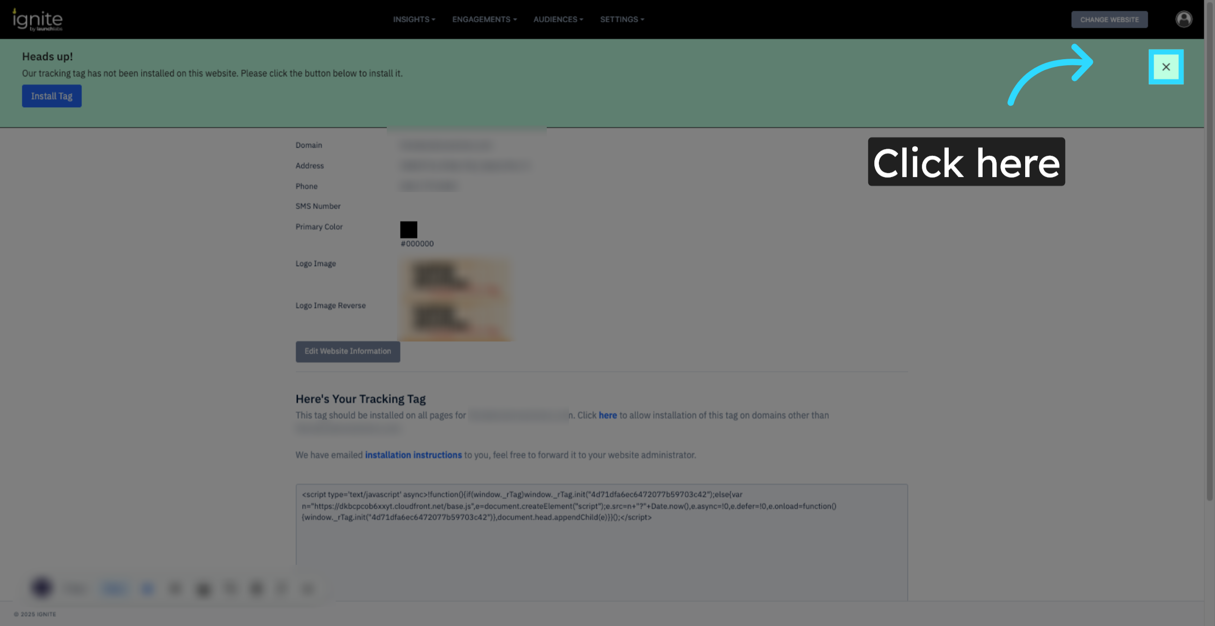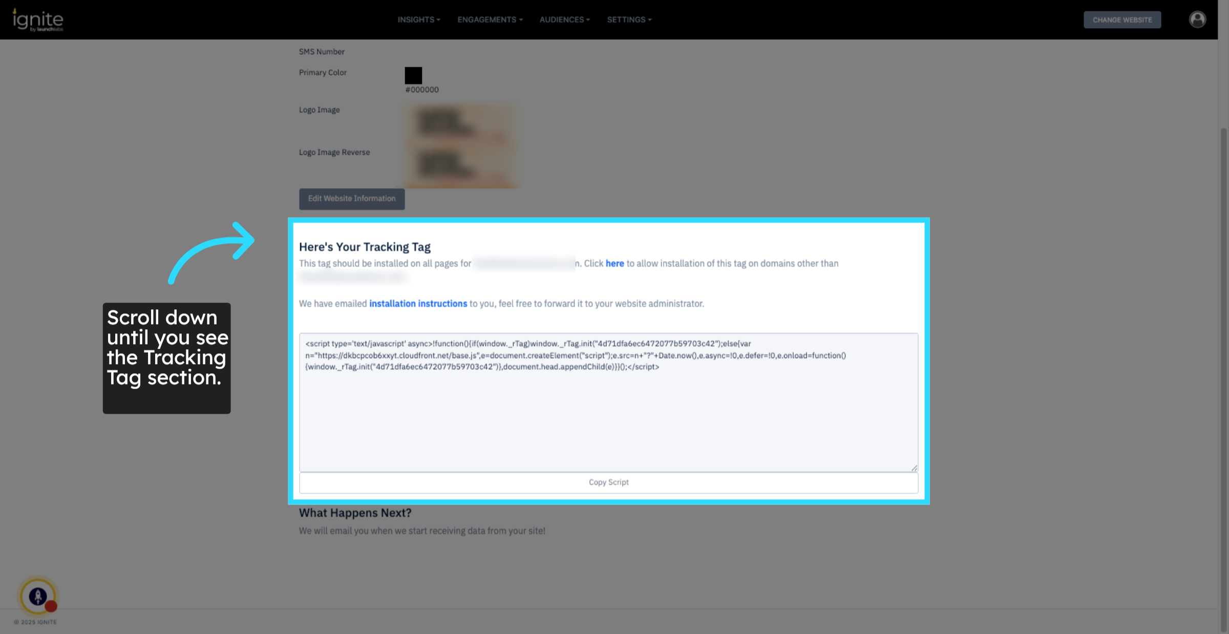 This article explains two ways to locate and copy your tracking tag within Ignite. The tracking tag is a small script that powers your website’s lead capture, visitor engagement, and data tracking capabilities.