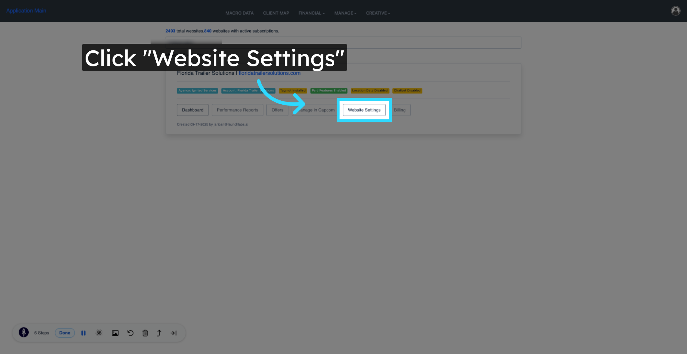 Click Website Settings in the top navigation. If the "Heads Up" message is still displayed, click the X in the top-right corner to dismiss it.