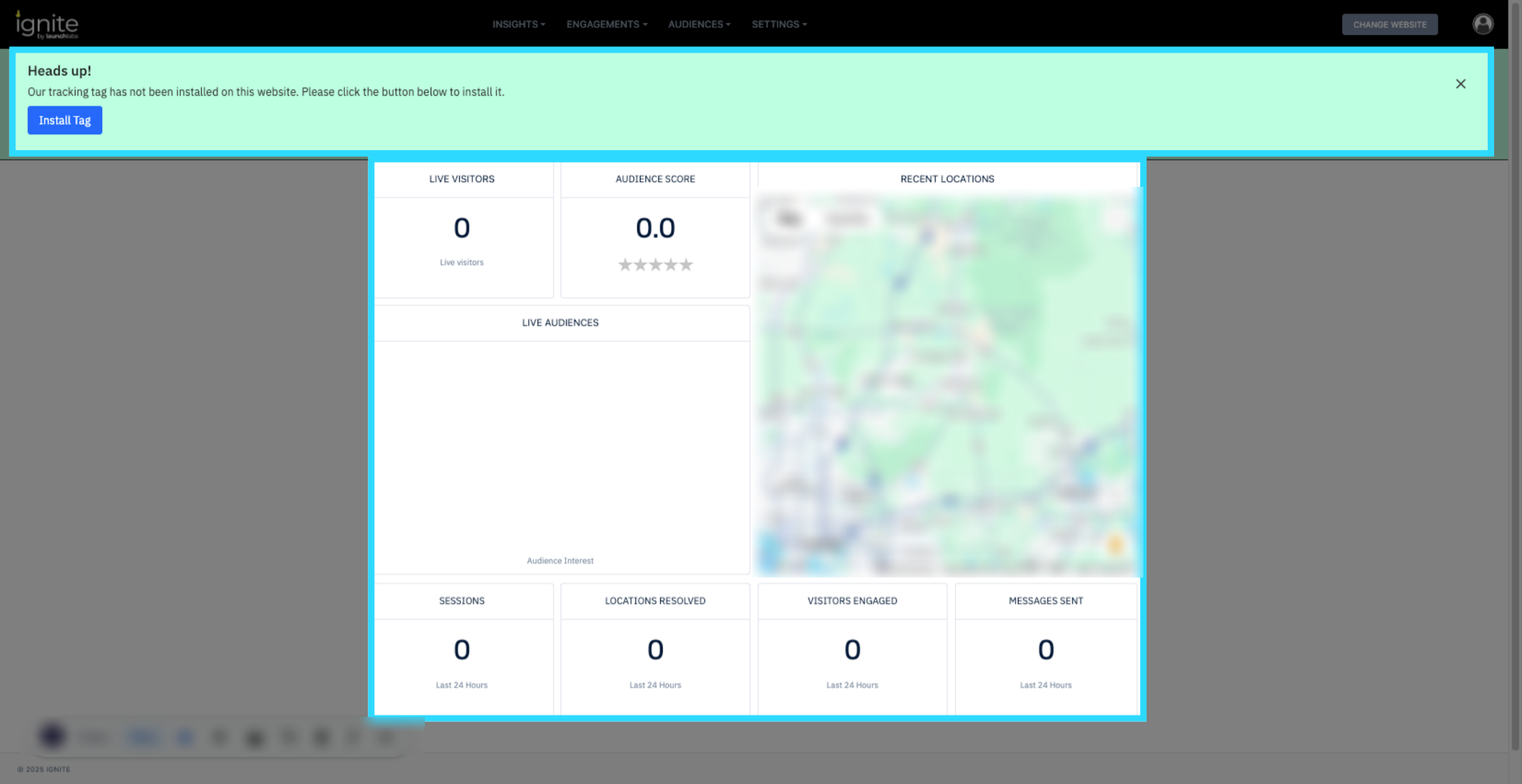 On the Dashboard page, you may see a green "Heads Up" notification if the tracking tag is not yet installed. You'll also notice that live data shows as all zeros, which indicates tracking hasn’t started.