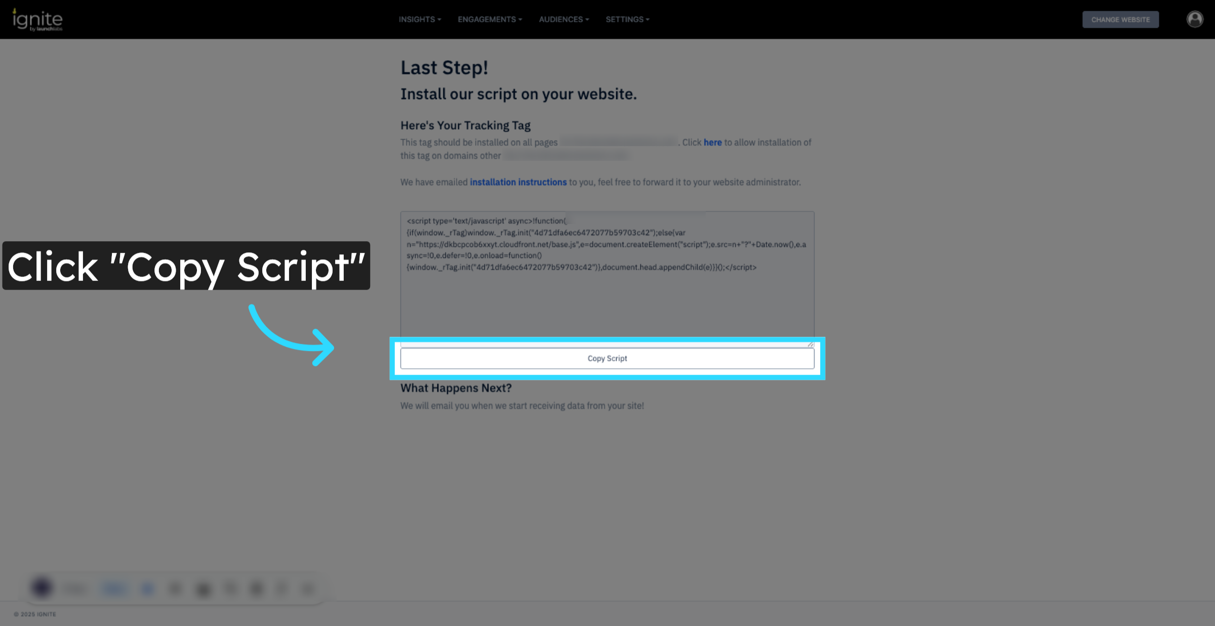 Click Install Tag to begin the tag setup process. When the script appears, click Copy Script to copy the tracking tag to your clipboard. This script should be provided to your IT team or website administrator for installation on the site.