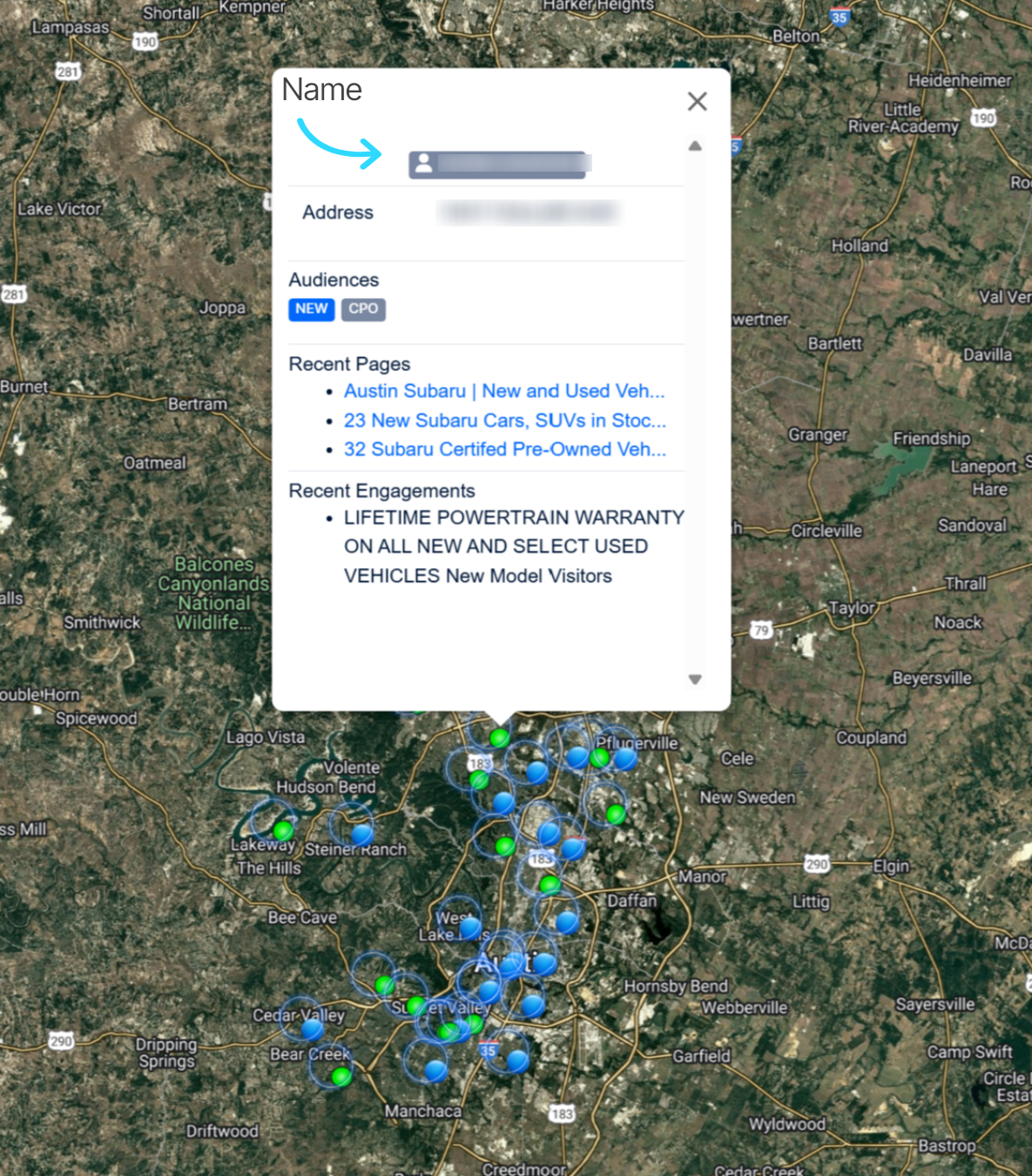 Clicking on a visitor dot will bring up an information page, displaying if available, information about the potential customer, the audiences they fall under, the recent pages they visited, and the recent engagements of the person at the location identified.
