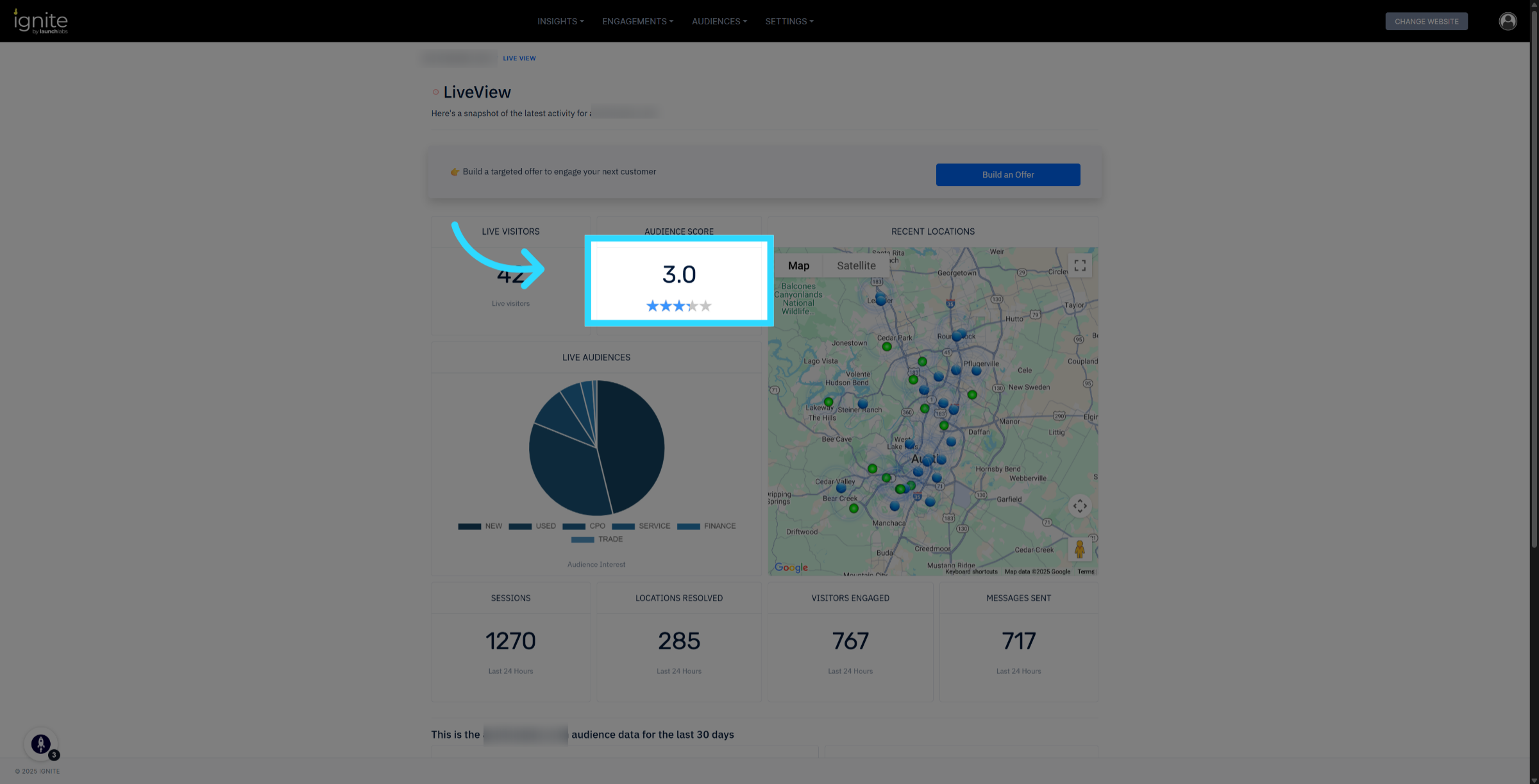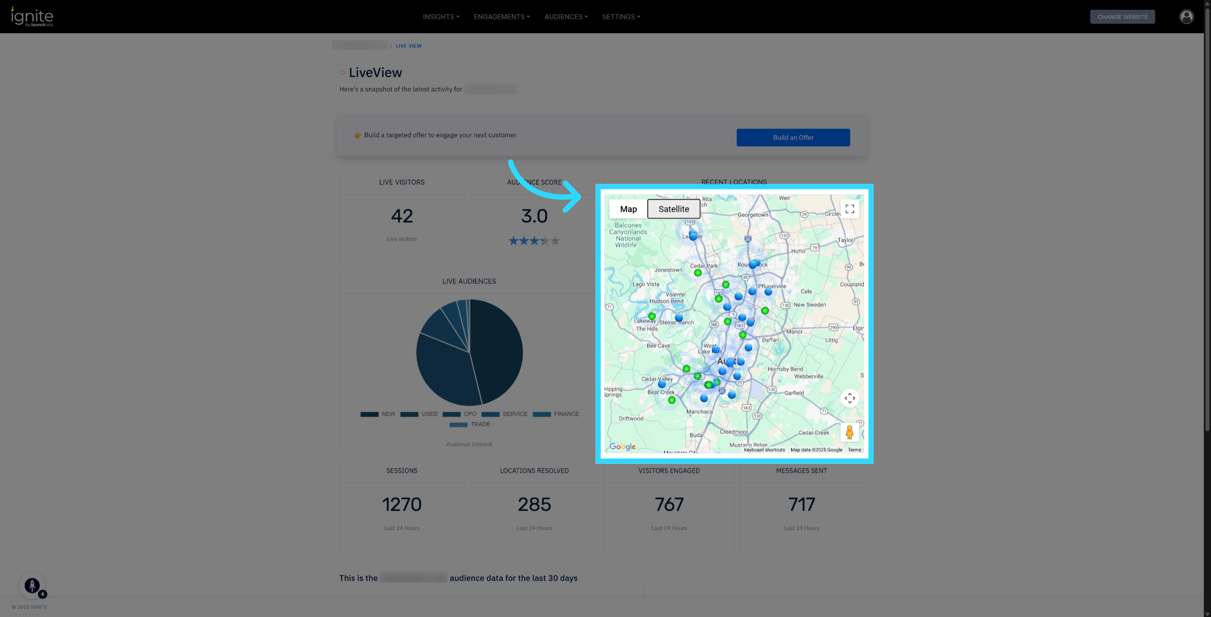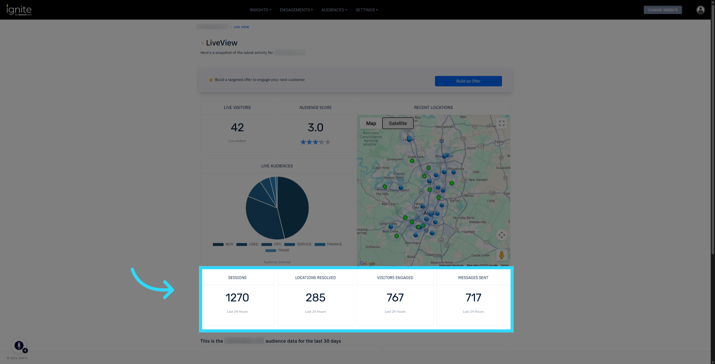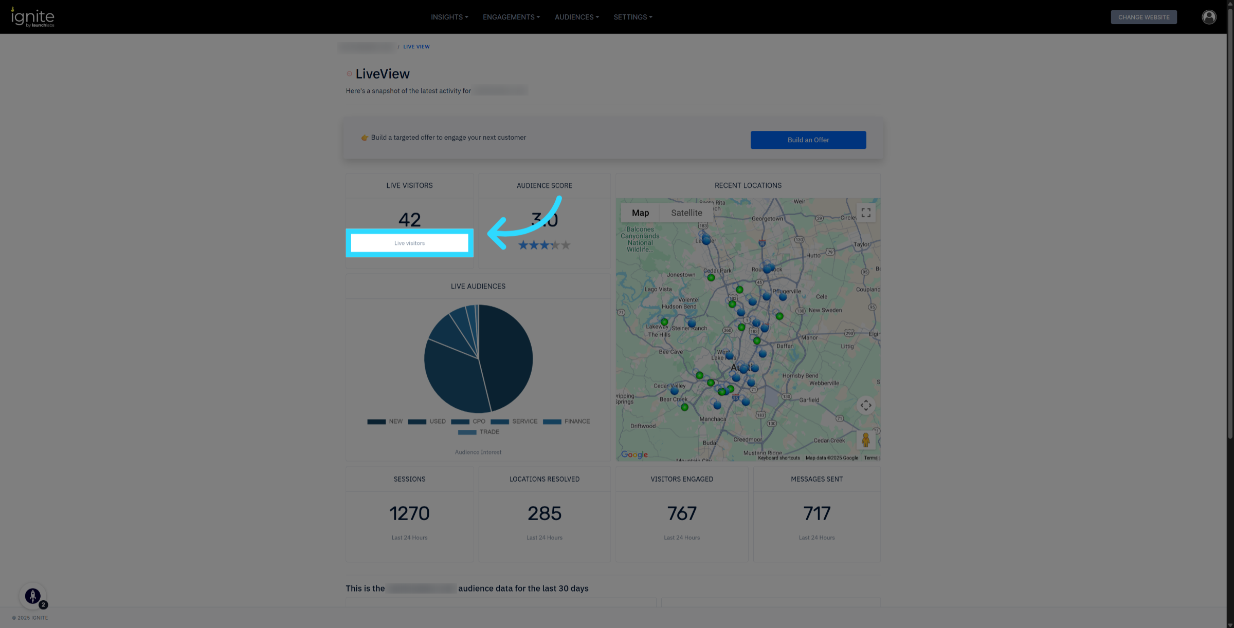 This article explains how to find and navigate the LiveView feature in Ignite. LiveView enables you to monitor live and recent visitor activity on your website with interactive map tools and enhanced insights. LiveView is located under the Insights dropdown in Ignite.