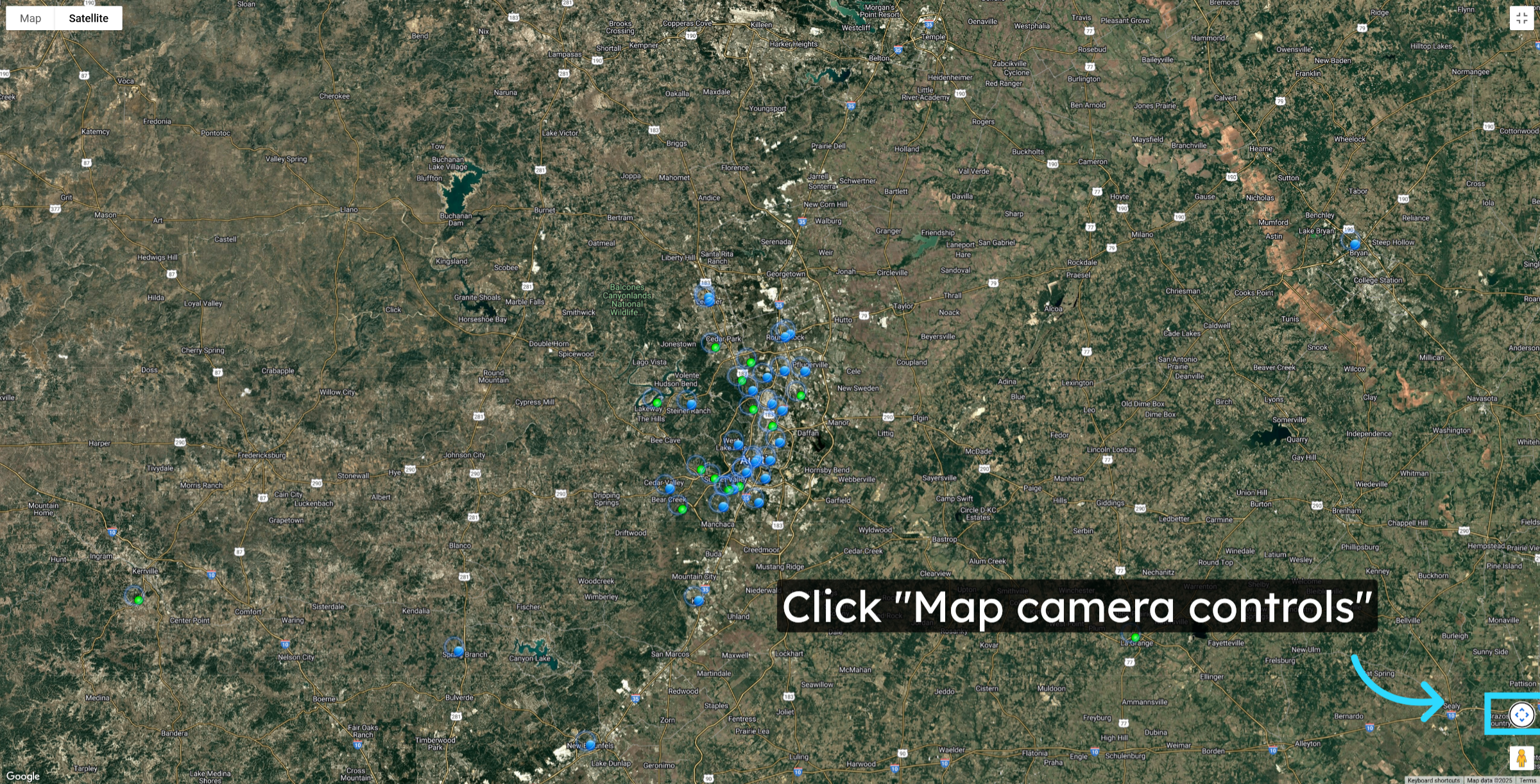 Within the Fullscreen map controls, you can use the "Map camera controls" button to access navigation tools that let you adjust the map view. You can also move the view of the map by simply clicking and dragging.