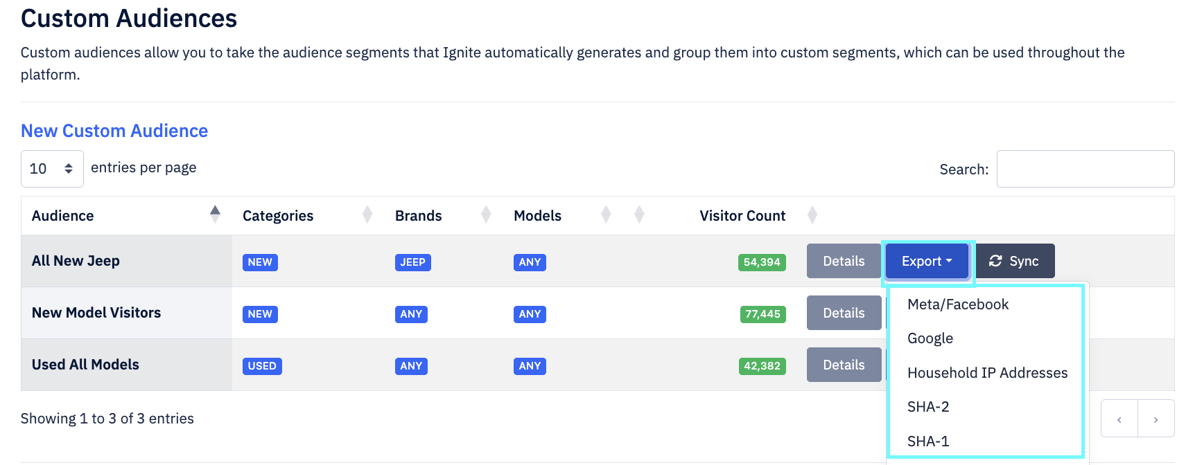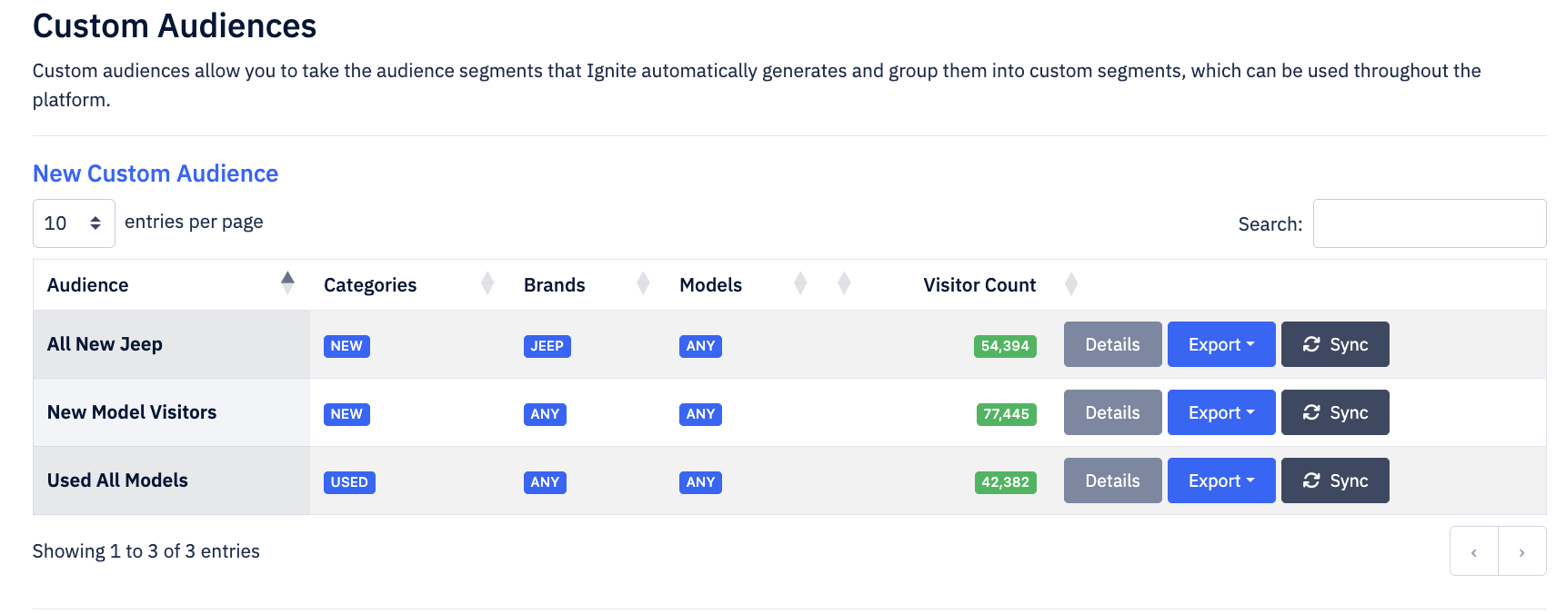 For example, you can create audiences such as “All New Jeep Vehicles” or “All New EV Chevys”, enabling you to engage specific groups more effectively and export data for CRM use.