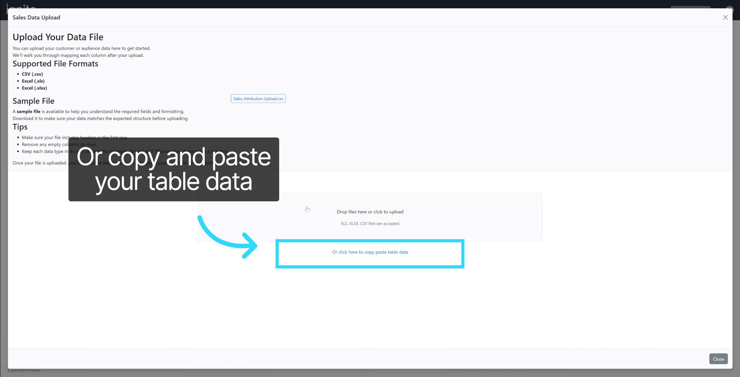 Click the HERE link to open the upload interface. Select Upload Sales Data File. Drag and drop your file into the upload area or click to browse. CSV, XLSX, and XLS formats are accepted. If preferred, you can also choose Copy/Paste Table Data to paste data directly.