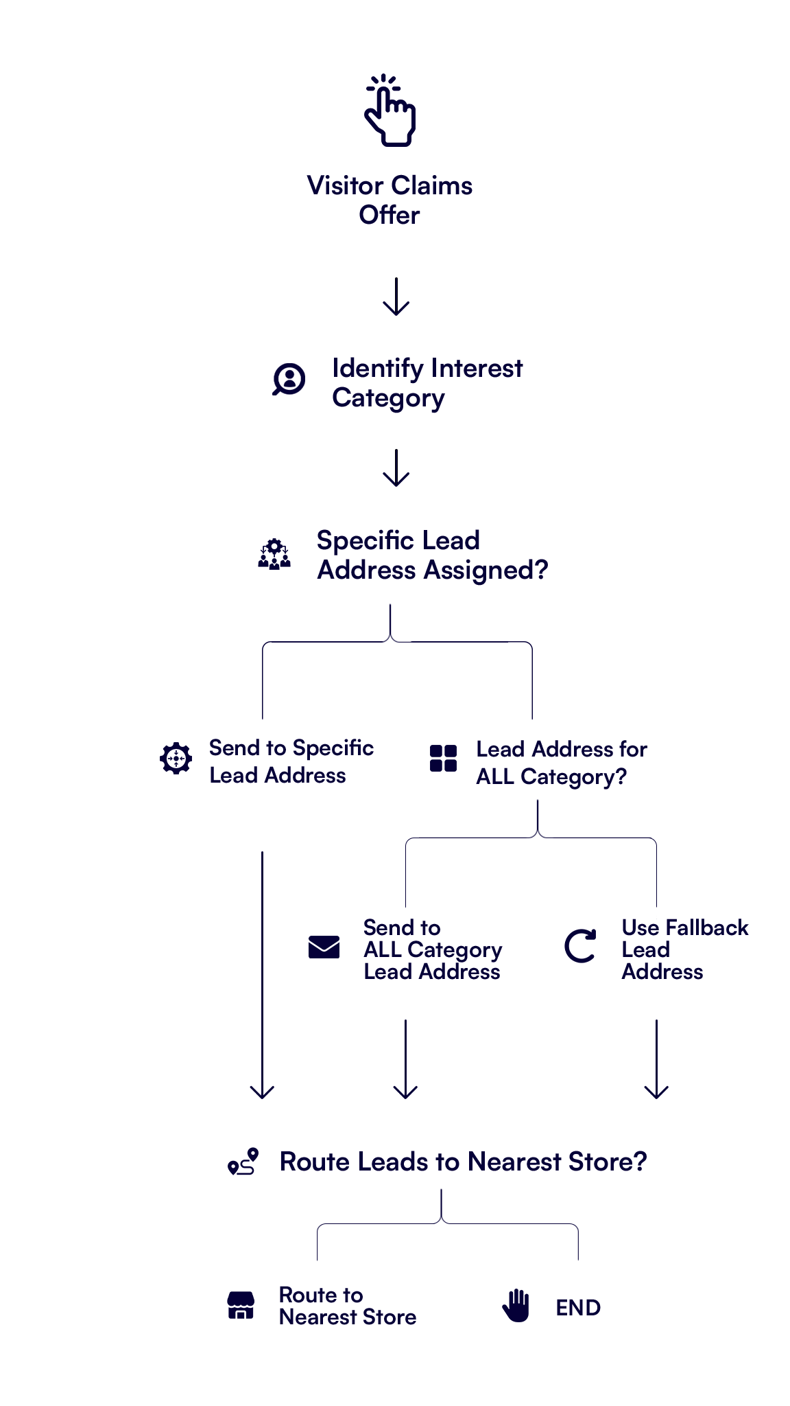 Next, the system checks whether the selected Interest Category has a lead address (or multiple addresses) assigned to it. If it does, the lead is immediately routed to that address, and no further checks are made.