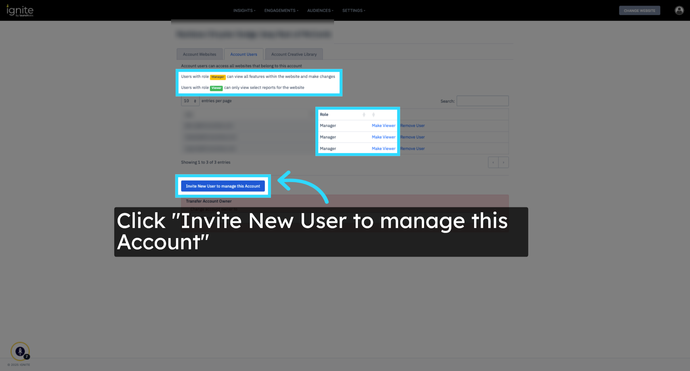 This article explains how to invite a new user to manage a website account in Ignite. You can assign roles such as Manager or Viewer, depending on the level of access the user needs.