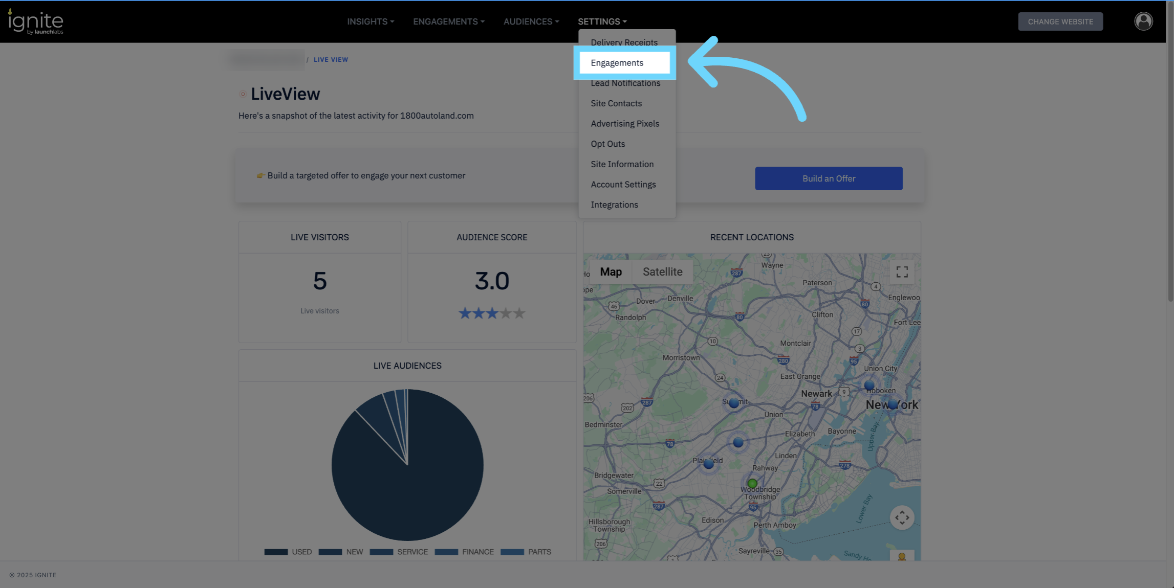 From the top navigation bar, click Settings, then select Engagements from the dropdown.