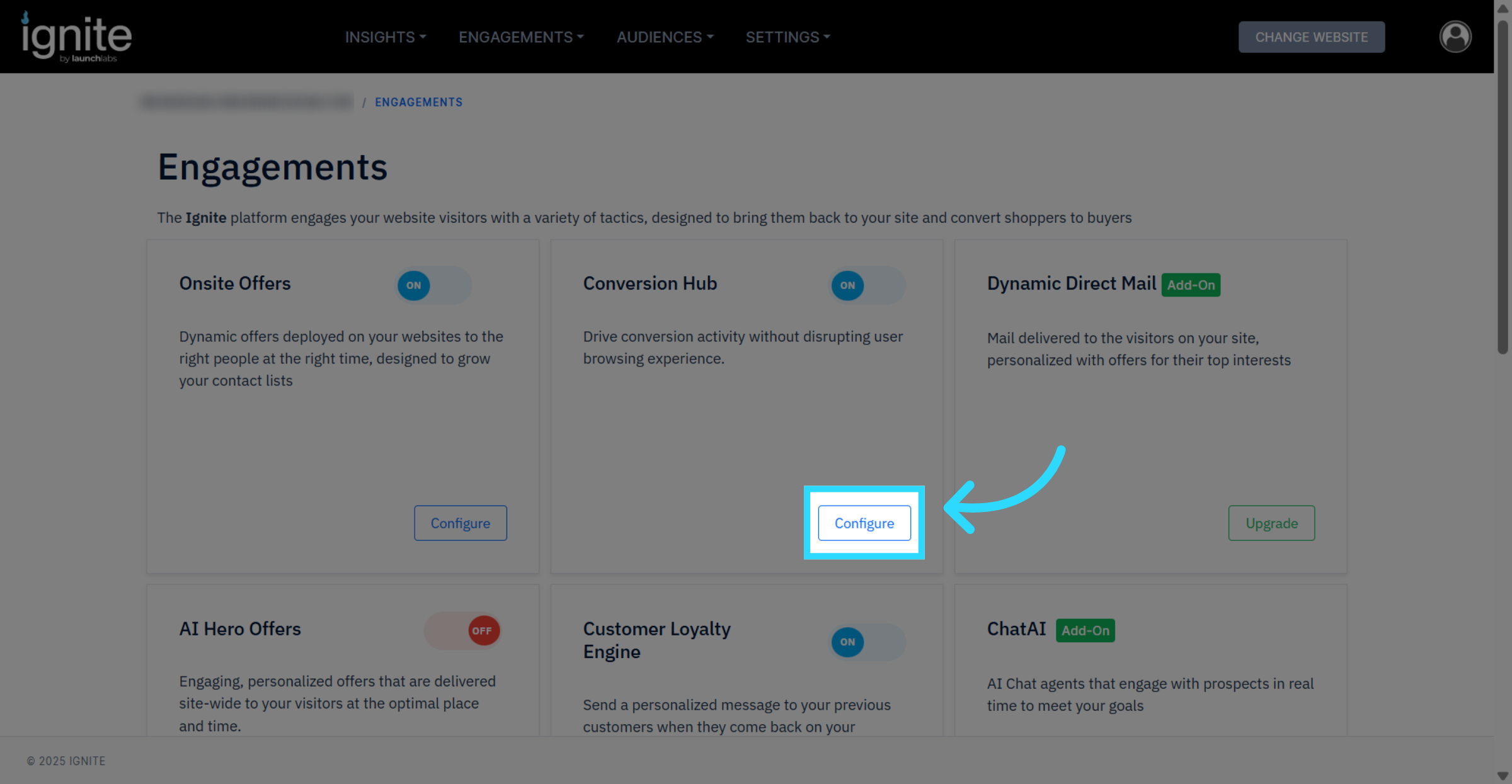 On the Engagements page, find Conversion Hub and confirm that it is toggled ON.