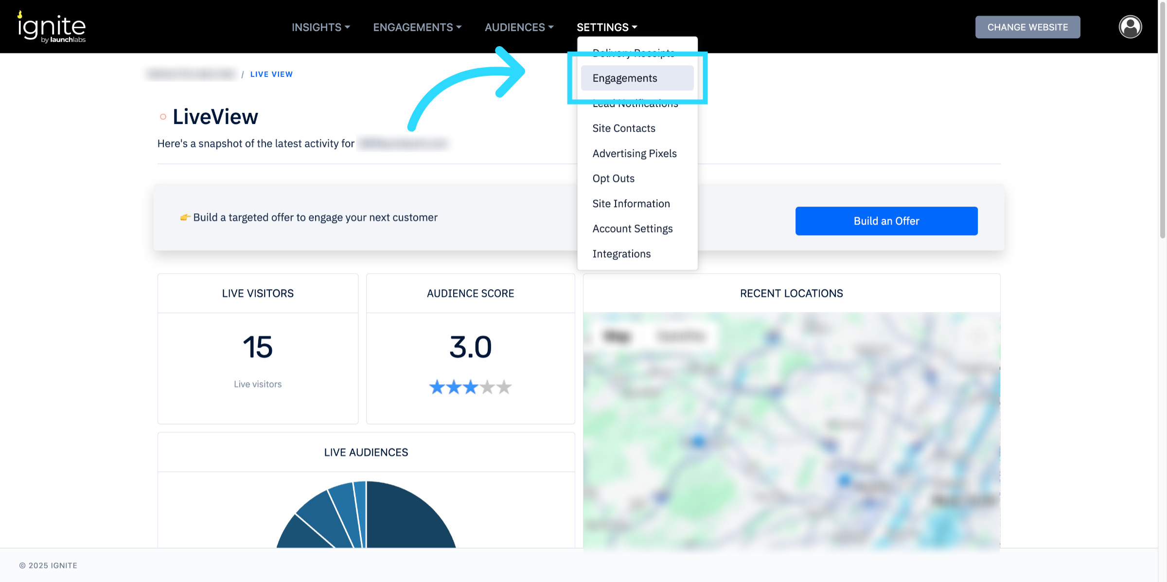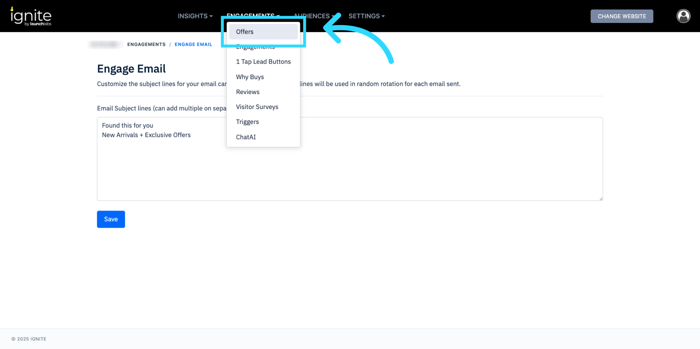 Go to the platform and click Settings in the top navigation bar and select Engagements.