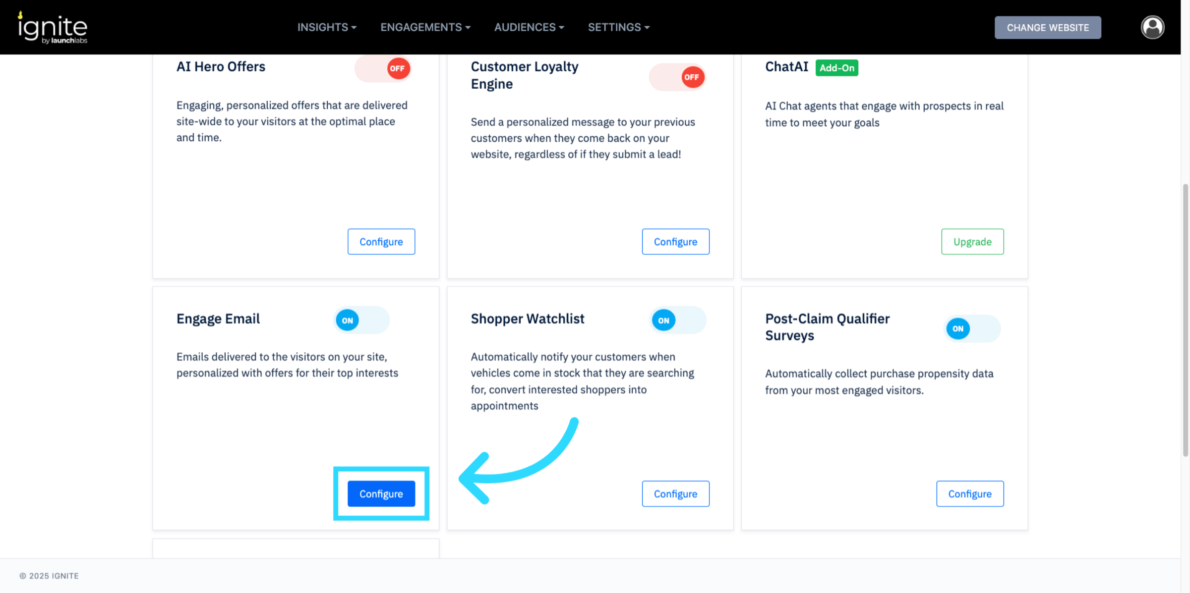 Locate Engage Email and toggle it On. Then click Configure to open the settings panel.