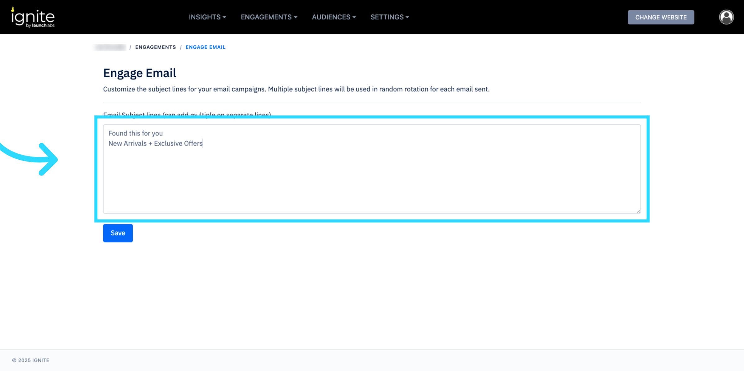 In the Email Subject Lines box, add or edit subject lines for your campaign. You can enter multiple options on separate lines to allow for varied messaging. Click Save when finished.