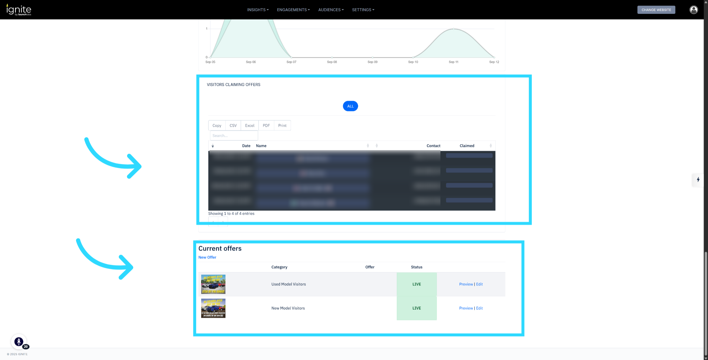 Review key conversion metrics such as leads captured, offers claimed, and shopper activity.